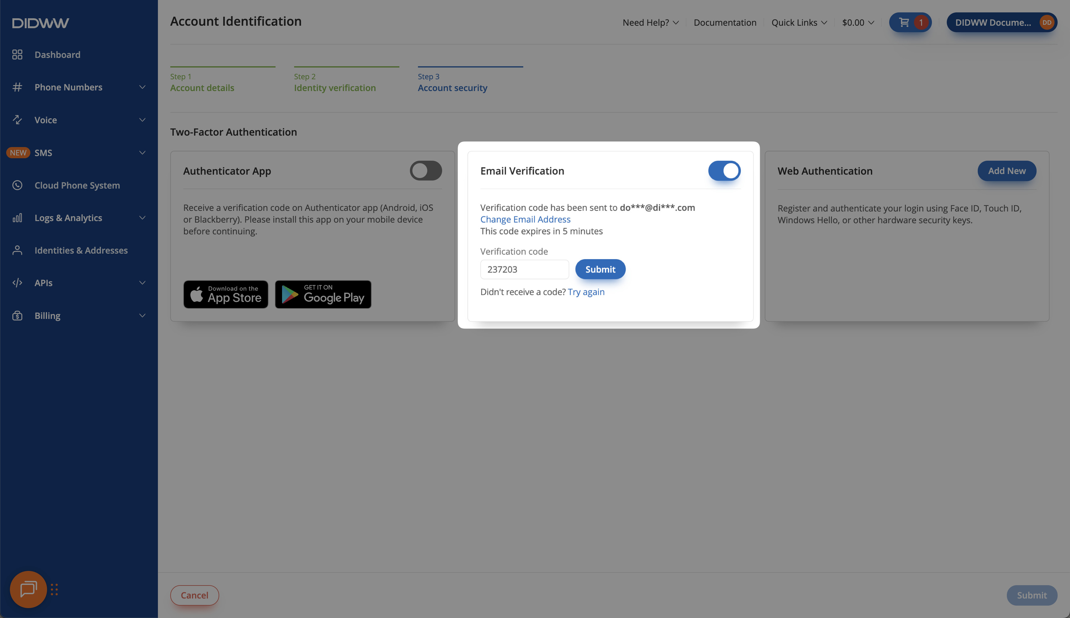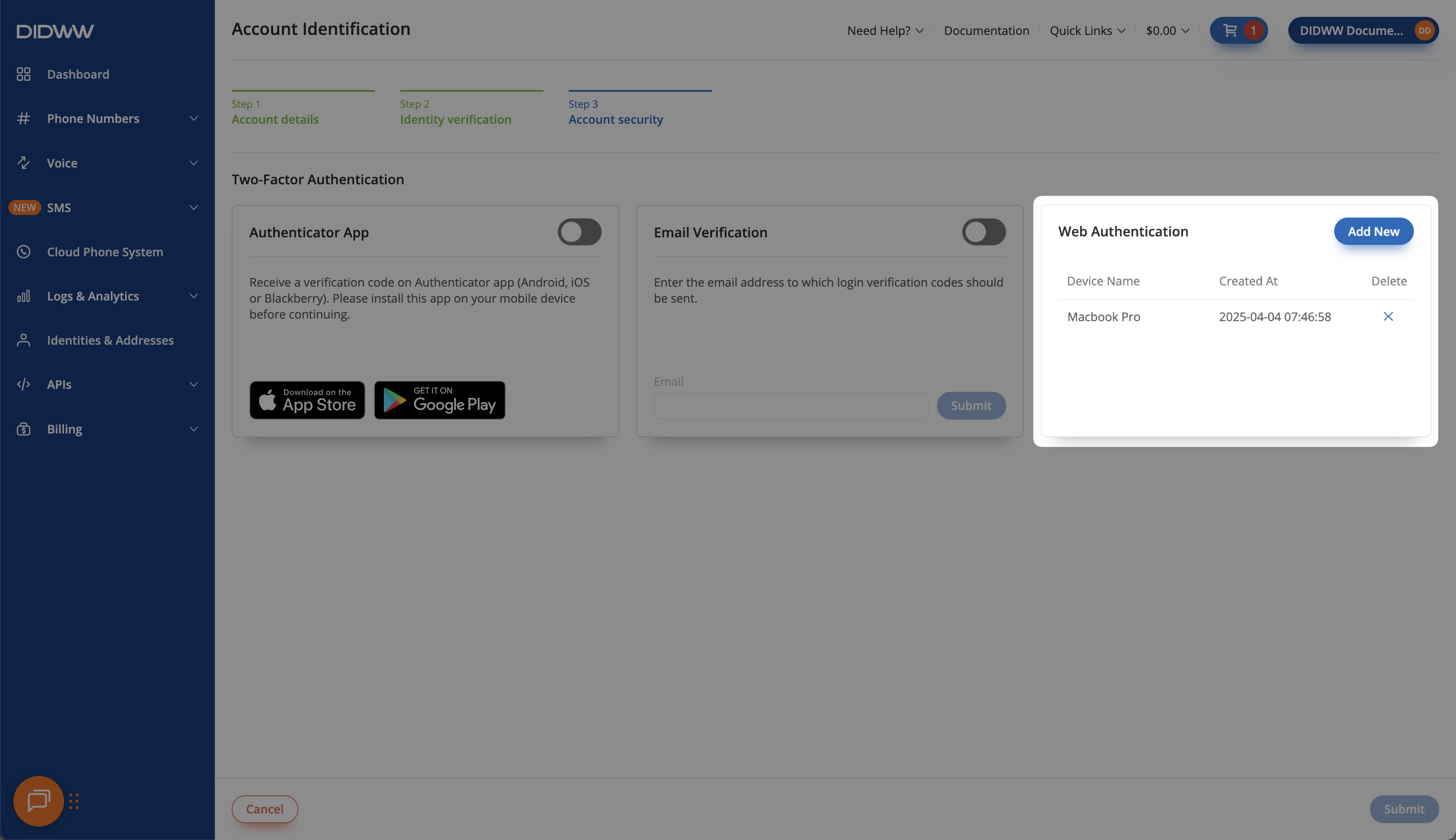 Set up Two-Factor Authentication (2FA) methods to protect your DIDWW account. Choose from multiple verification methods to add an extra layer of security when signing in.