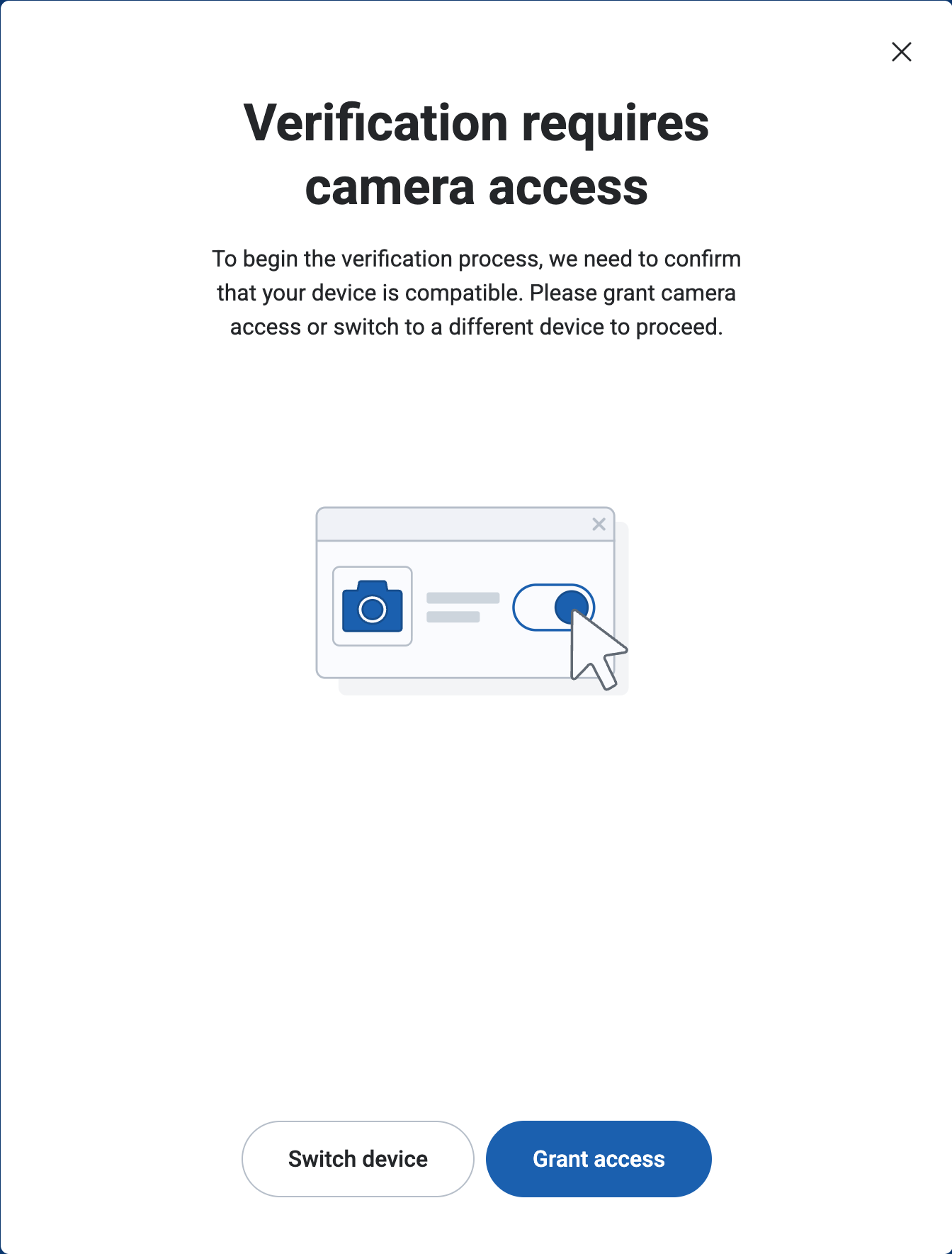 Selecting Grant access enables camera use for identity verification on the same device.
