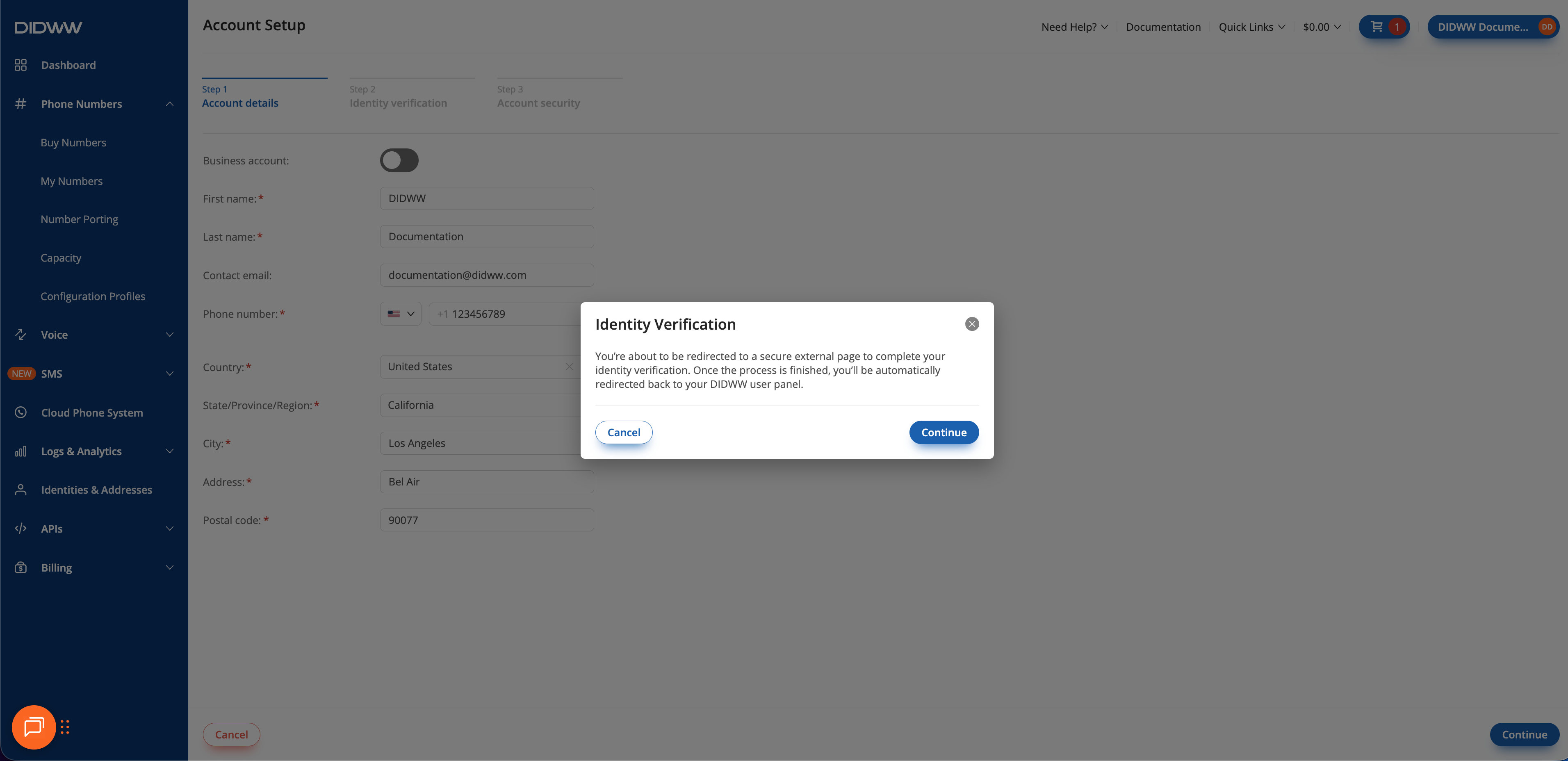 After submitting your details, a confirmation window will appear prompting you to continue with identity verification. Click Continue to start the verification process.