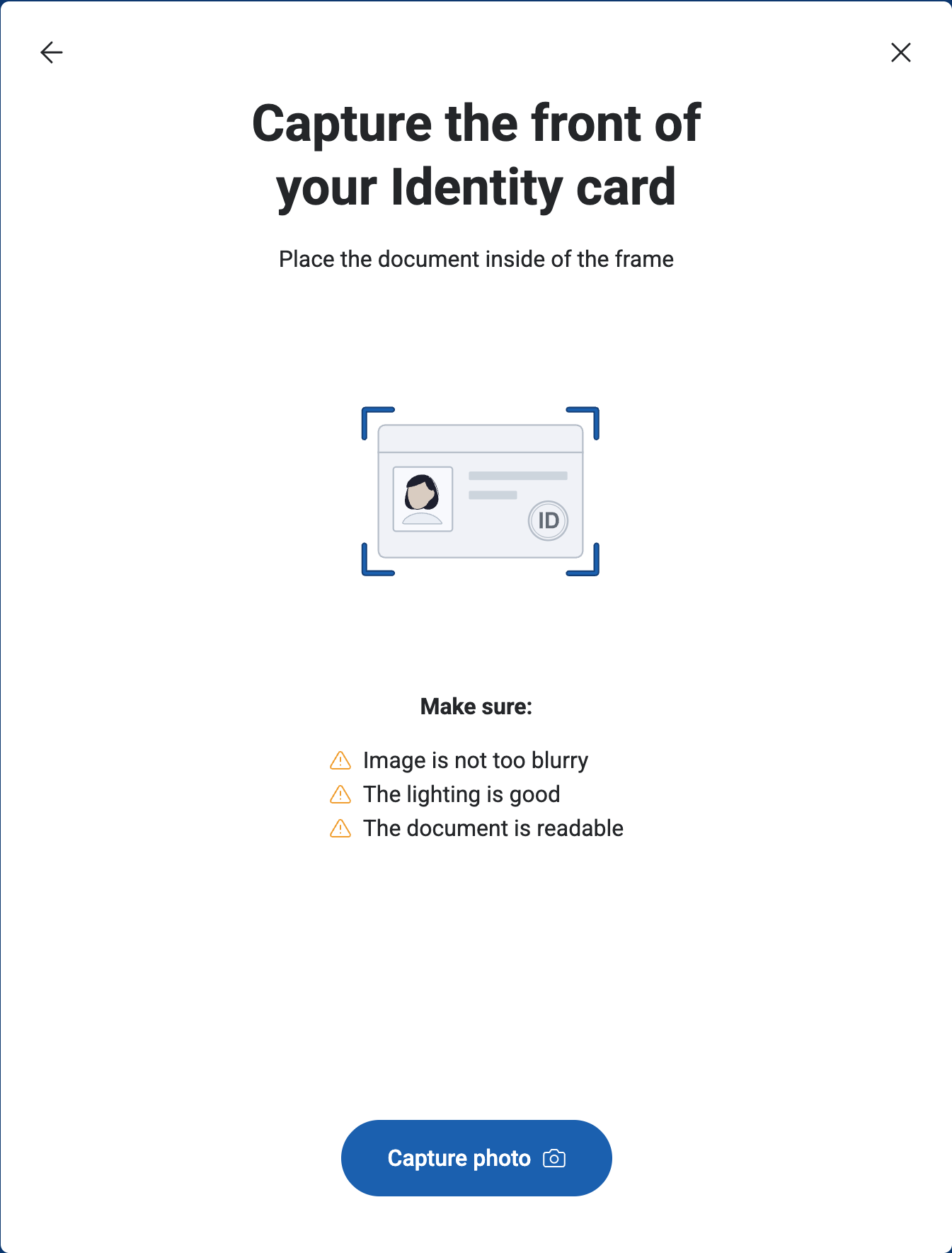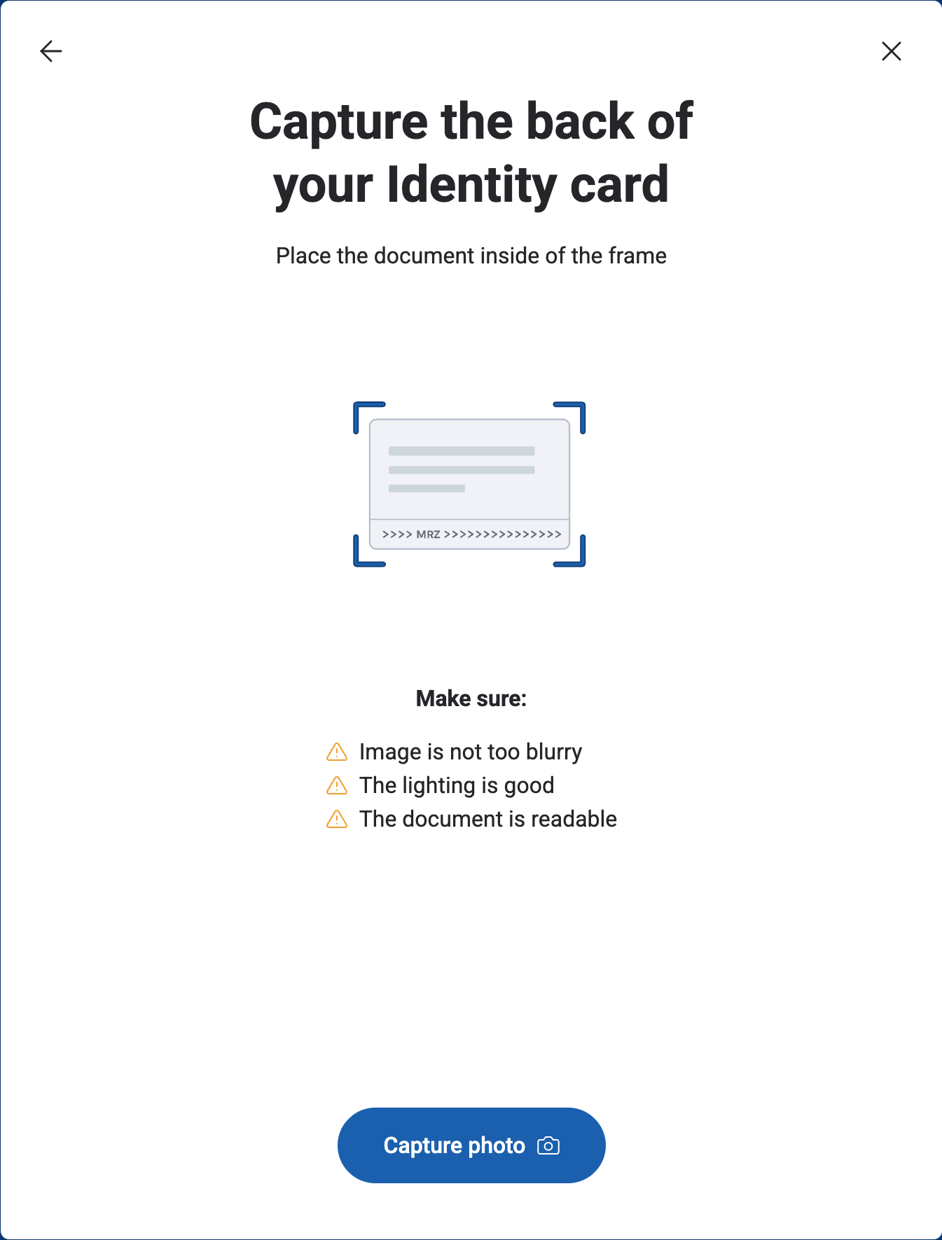 Use your device’s camera to take a clear photo of the front side of your document. Click Capture photo to begin the process.