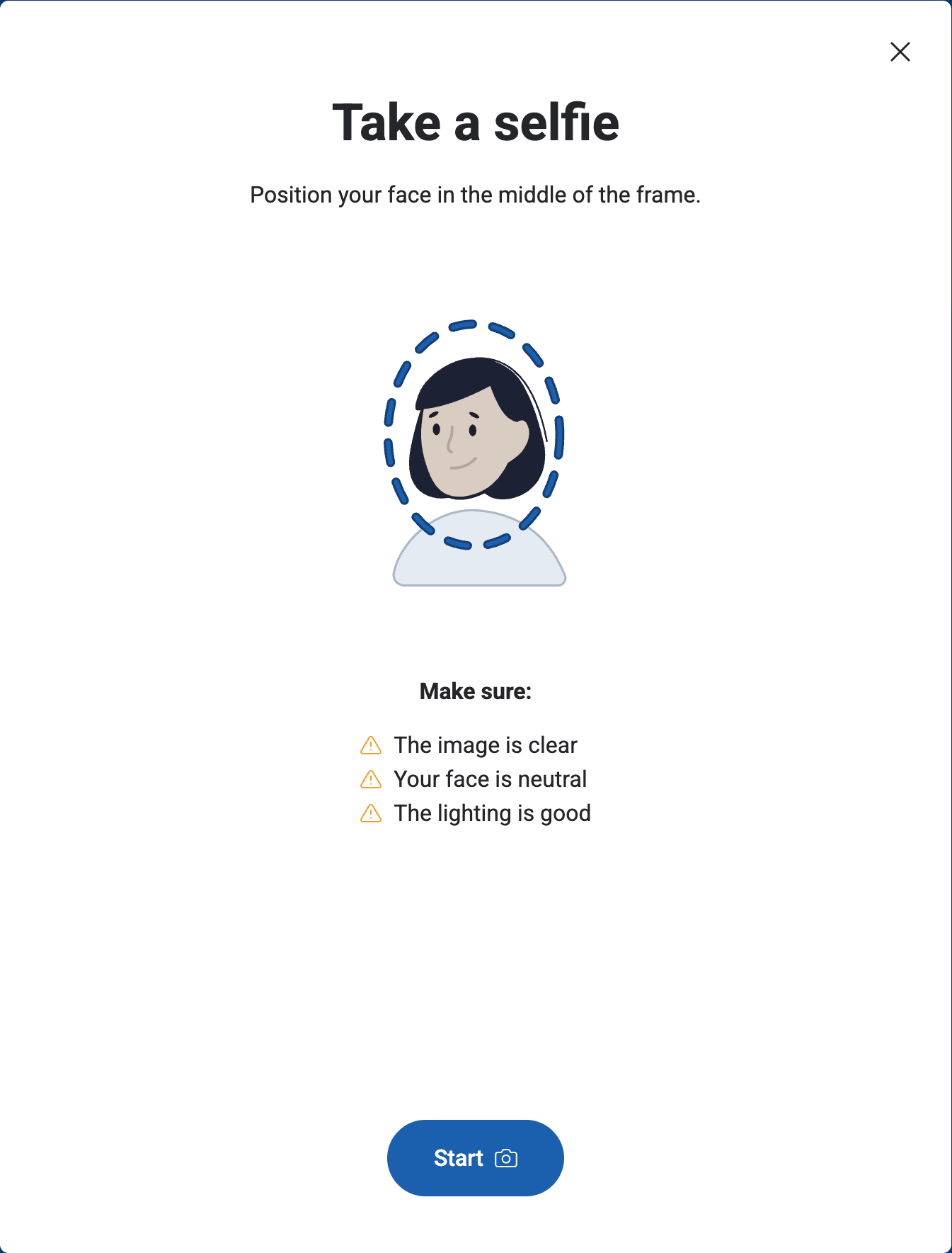Click Start and follow the on-screen instructions to take a selfie for identity verification. Position your face within the frame and ensure the image is clear.