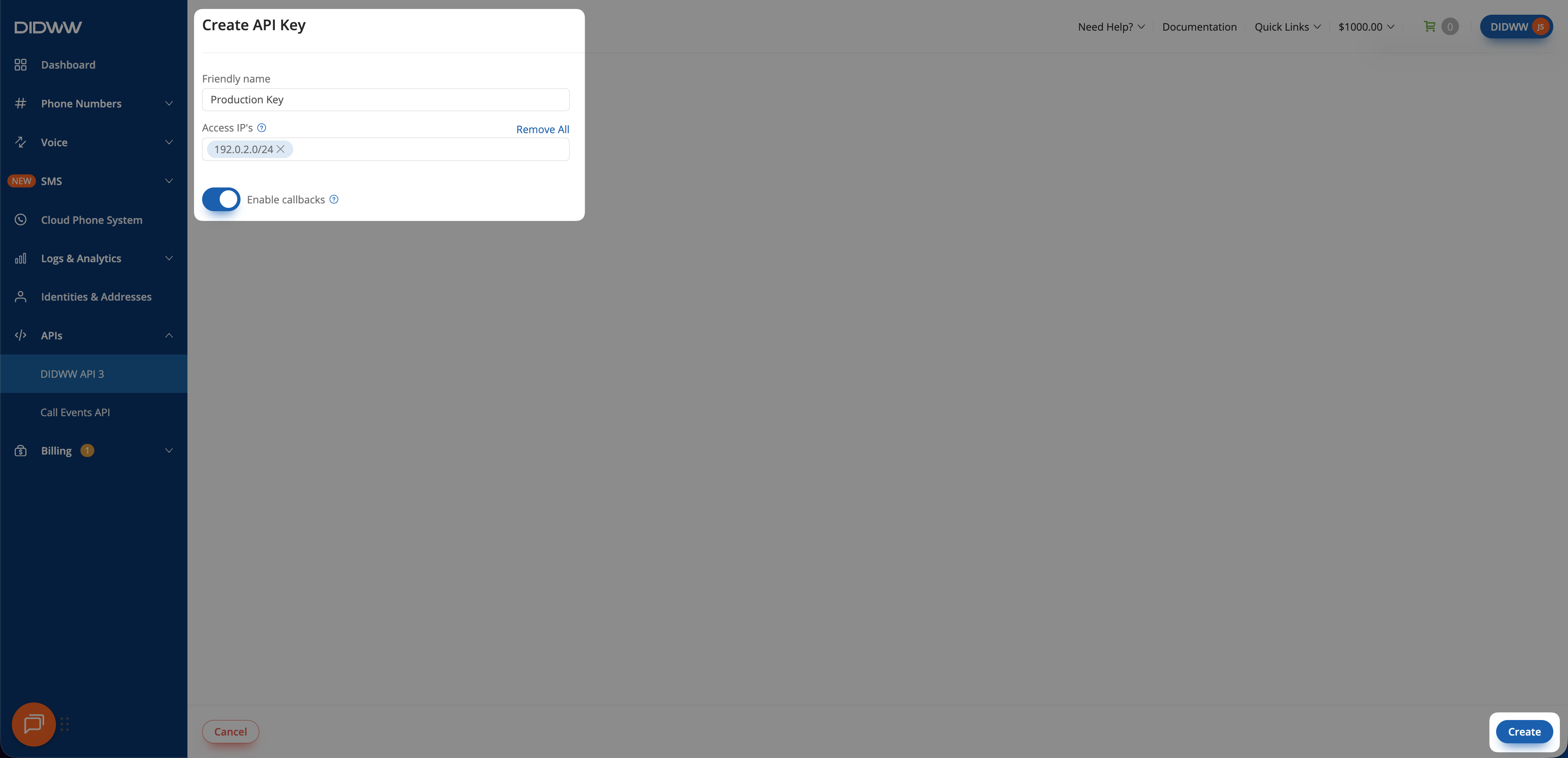 Fig. 2. Creating a new API Key in the DIDWW User Panel.
