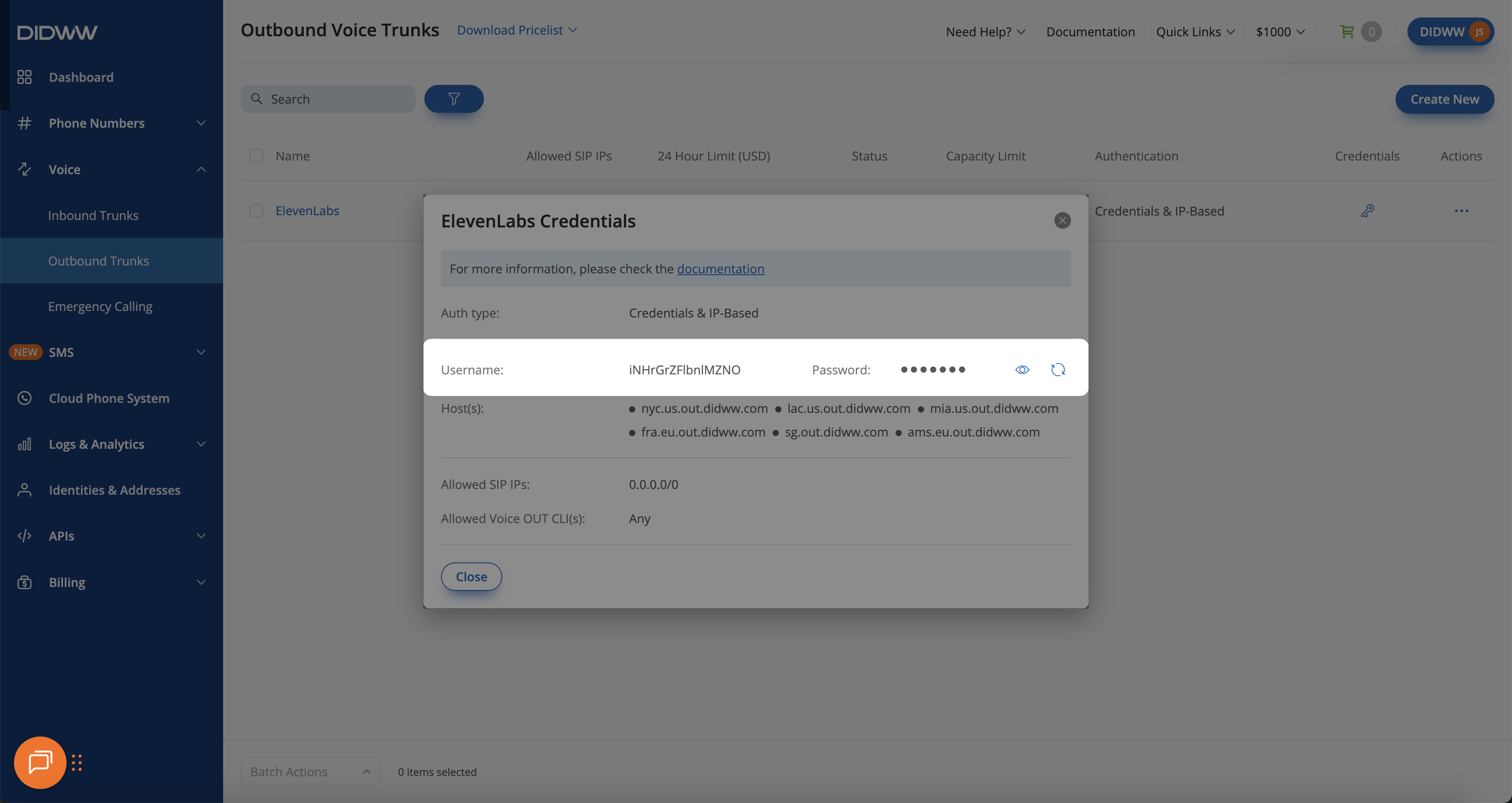 Fig. 5. Opening the Outbound Trunk Credentials in the DIDWW User Panel