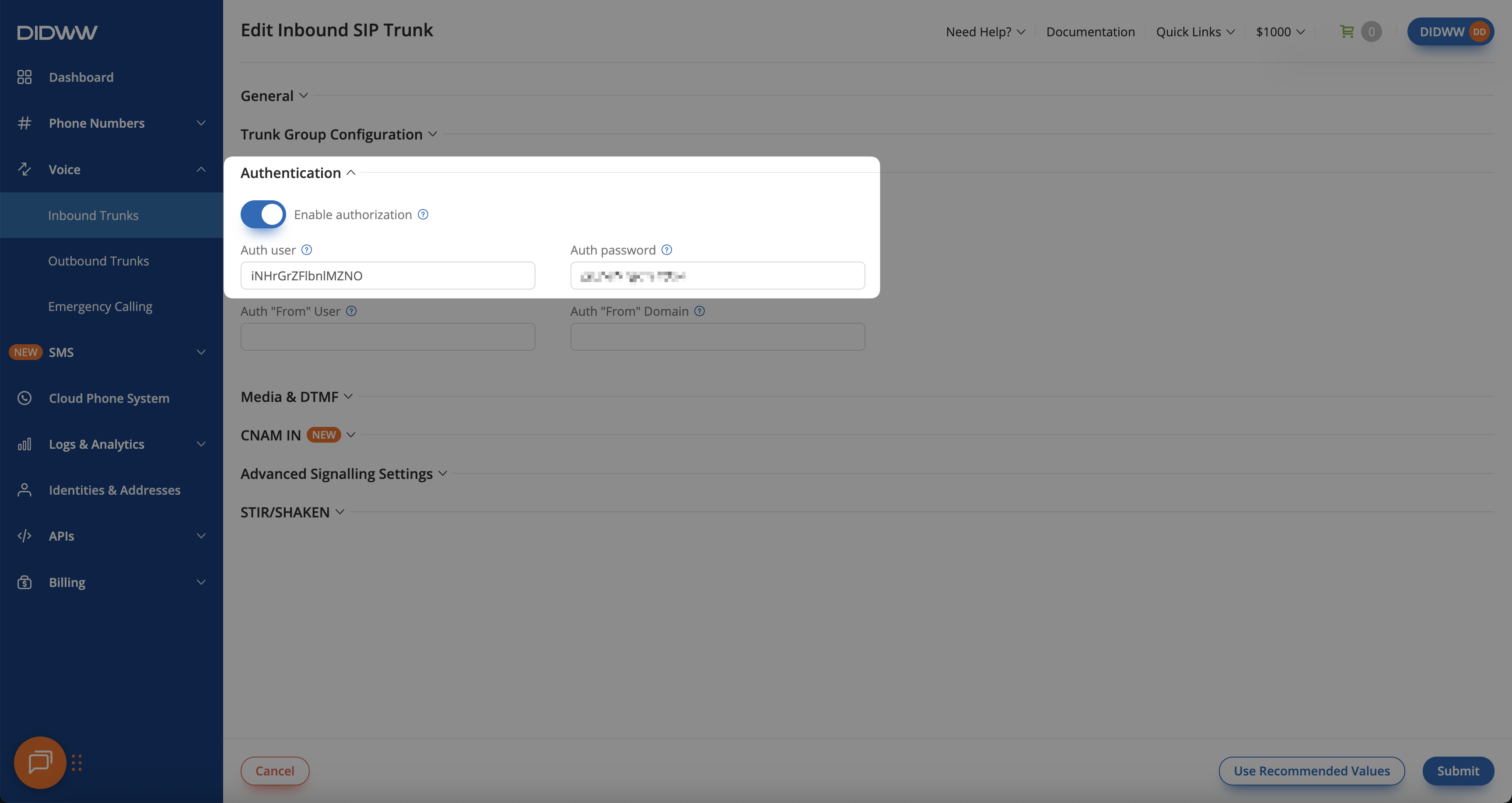 Fig. 11. Configuring inbound SIP authentication using DIDWW credentials