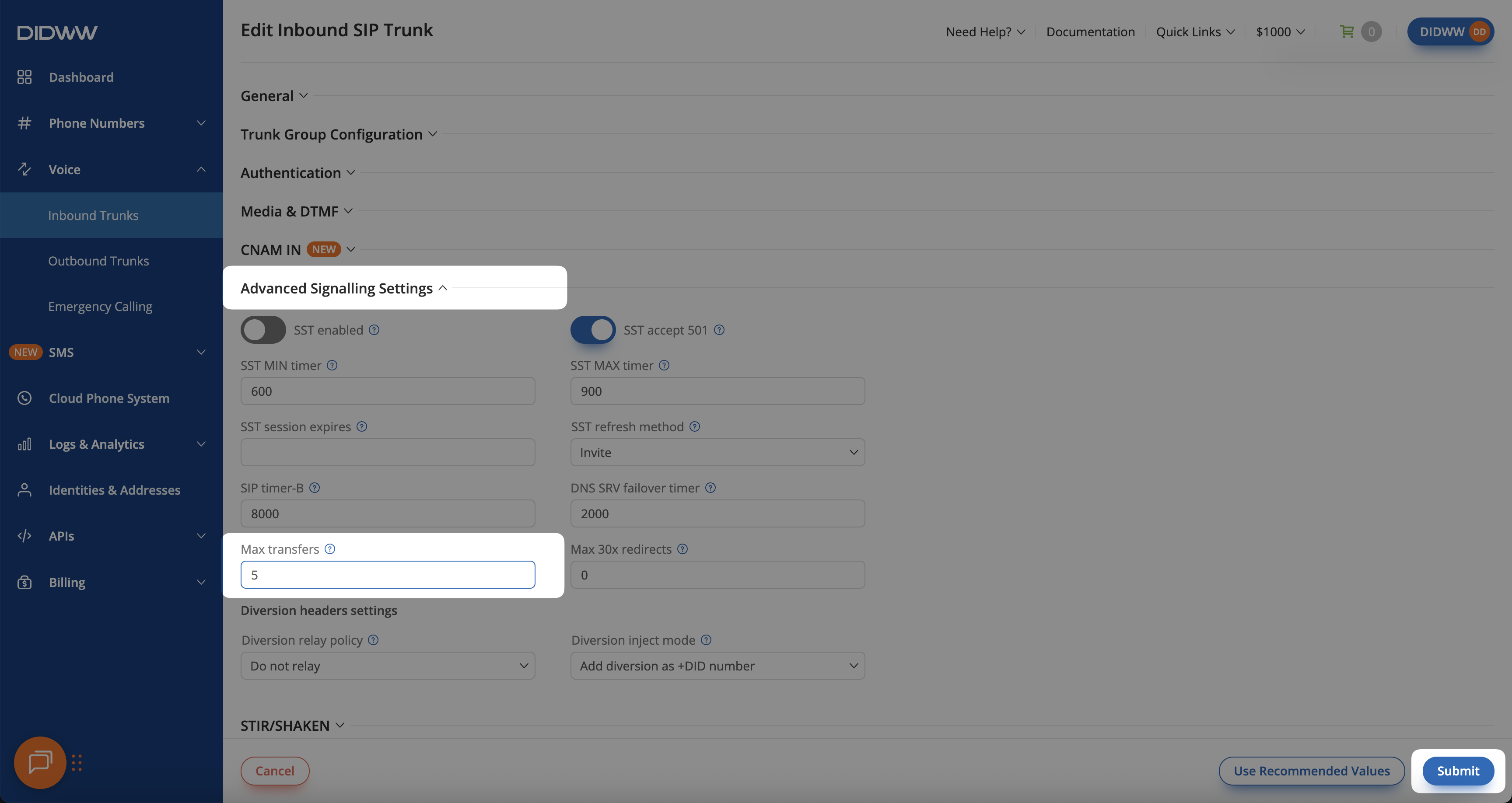 To enable in-dialog SIP REFER transfers between inbound and outbound trunks, you must adjust the Max transfers value in the Advanced Signaling Settings section.