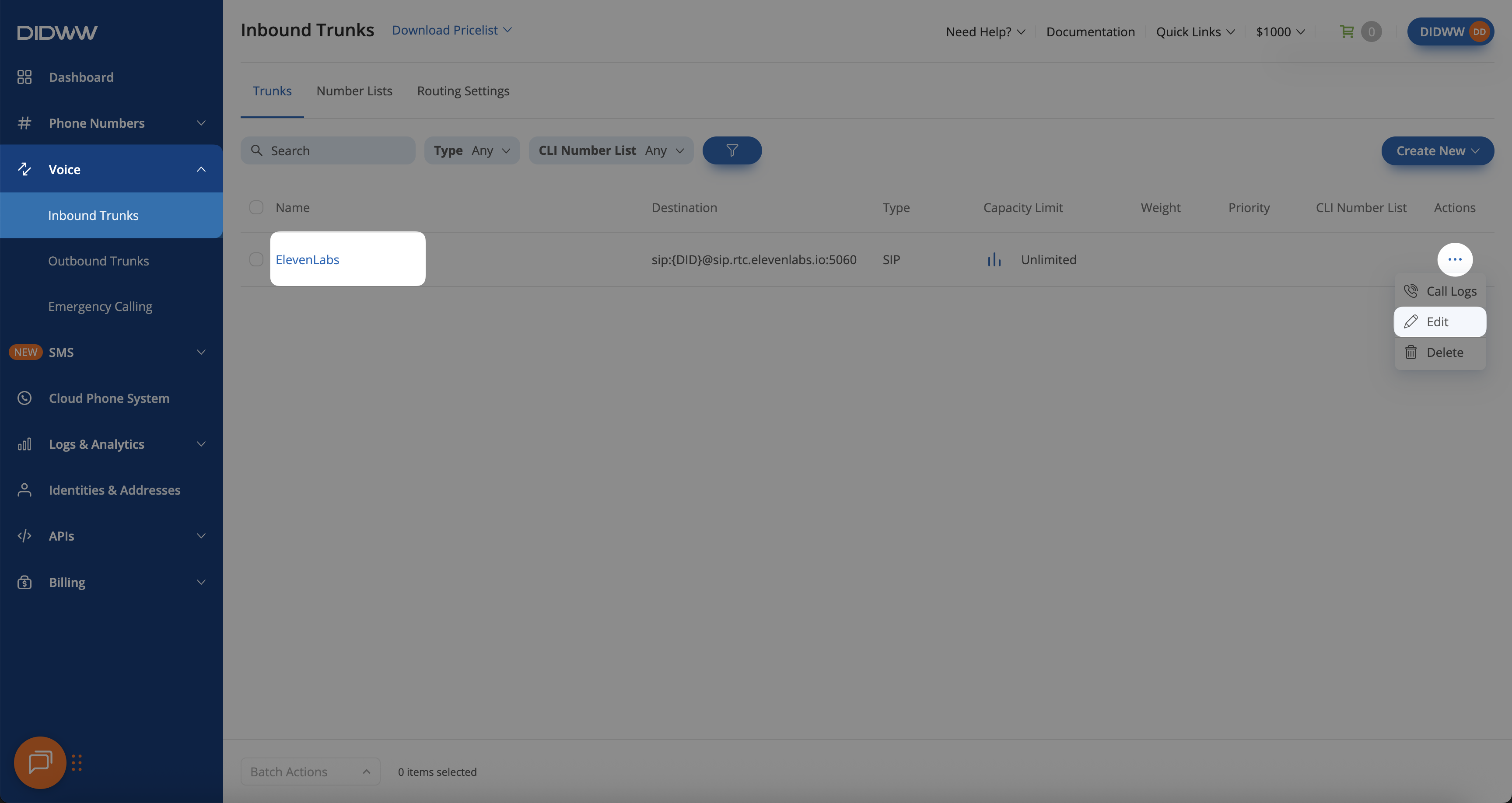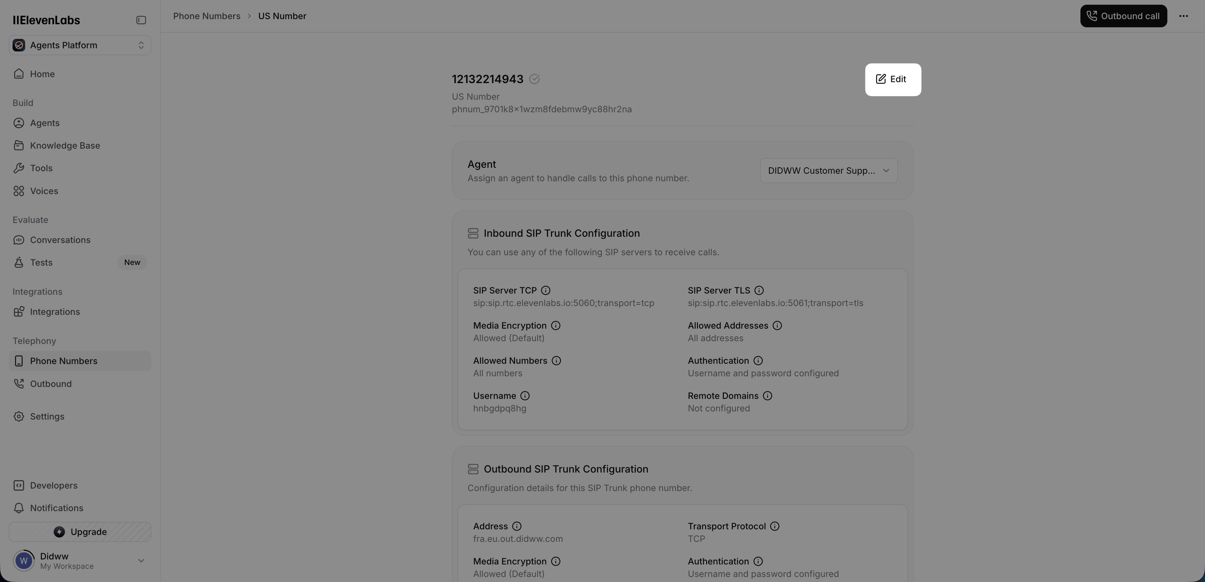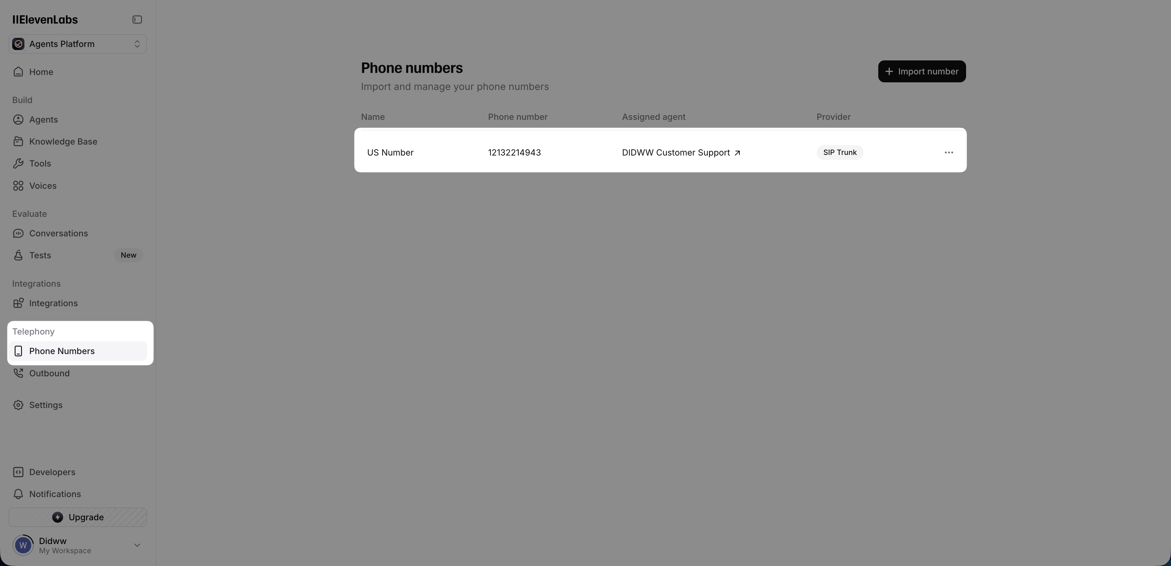 At least one Imported DIDWW Number must be available in your ElevenLabs account and linked to a valid SIP Trunk connection.