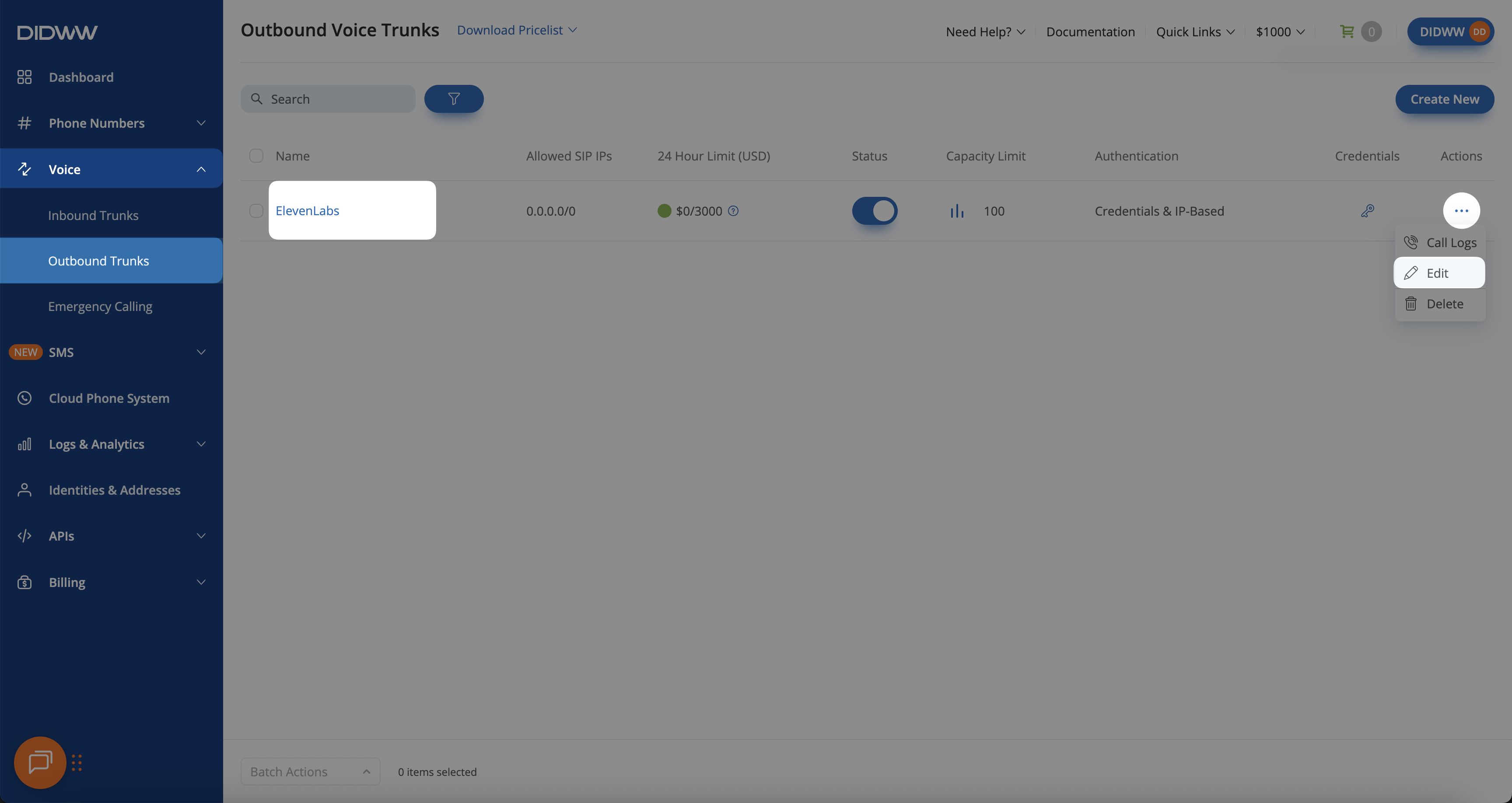 Click the trunk name or the Actions (⋯) icon, then select Edit.