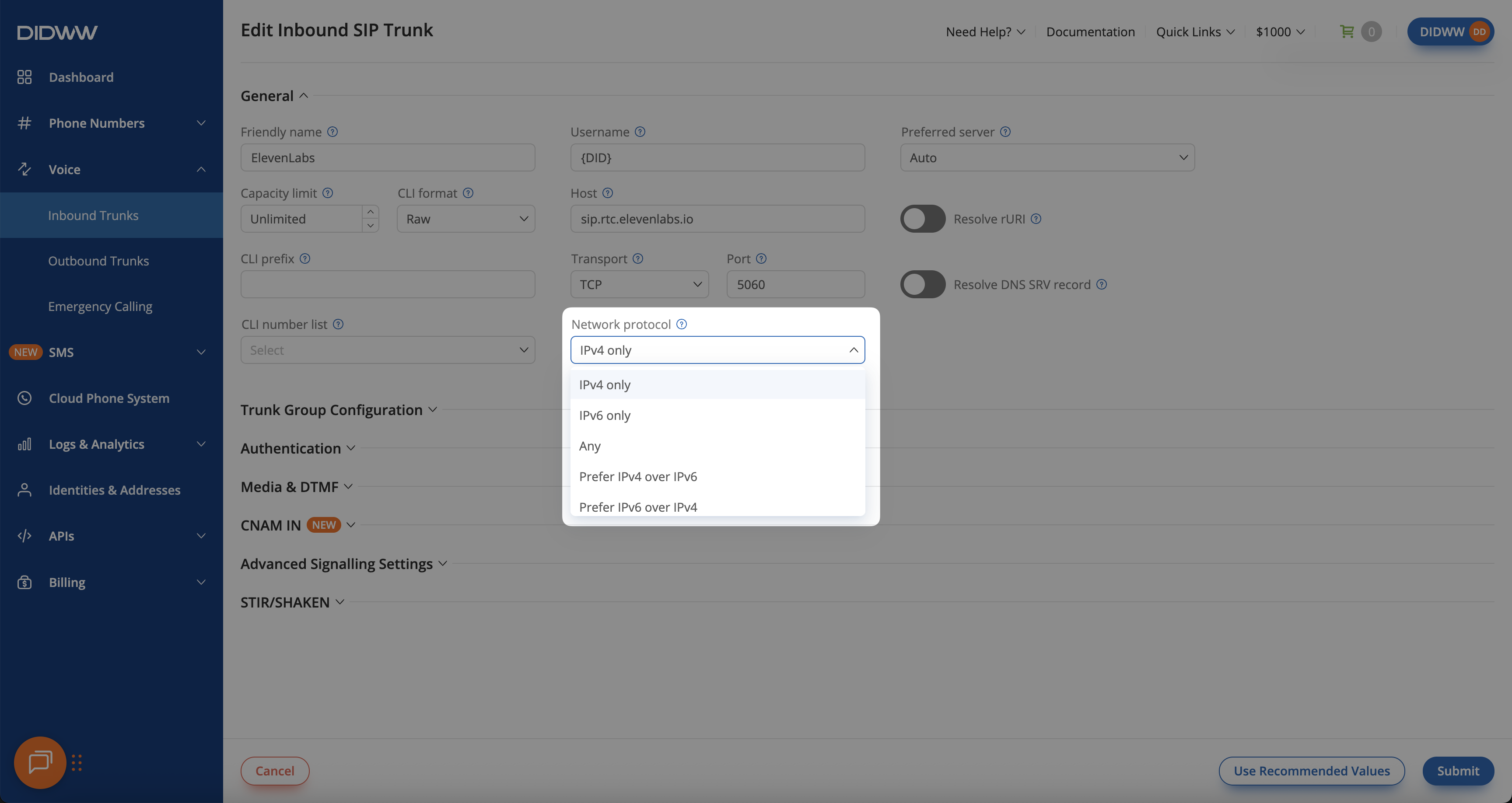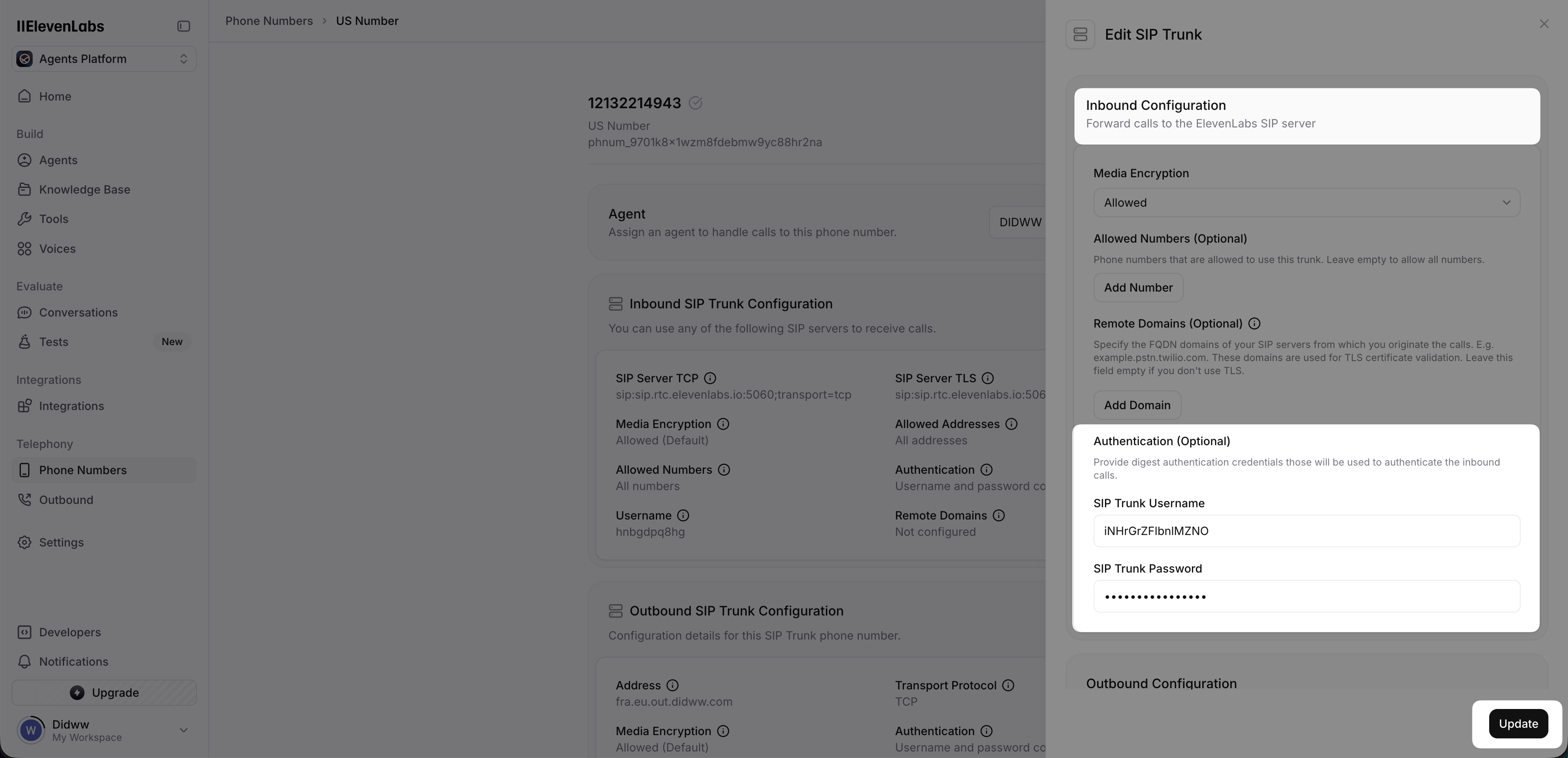 To allow ElevenLabs to authenticate inbound calls from DIDWW and enable call transfers, update the SIP Trunk configuration for your imported DIDWW number.