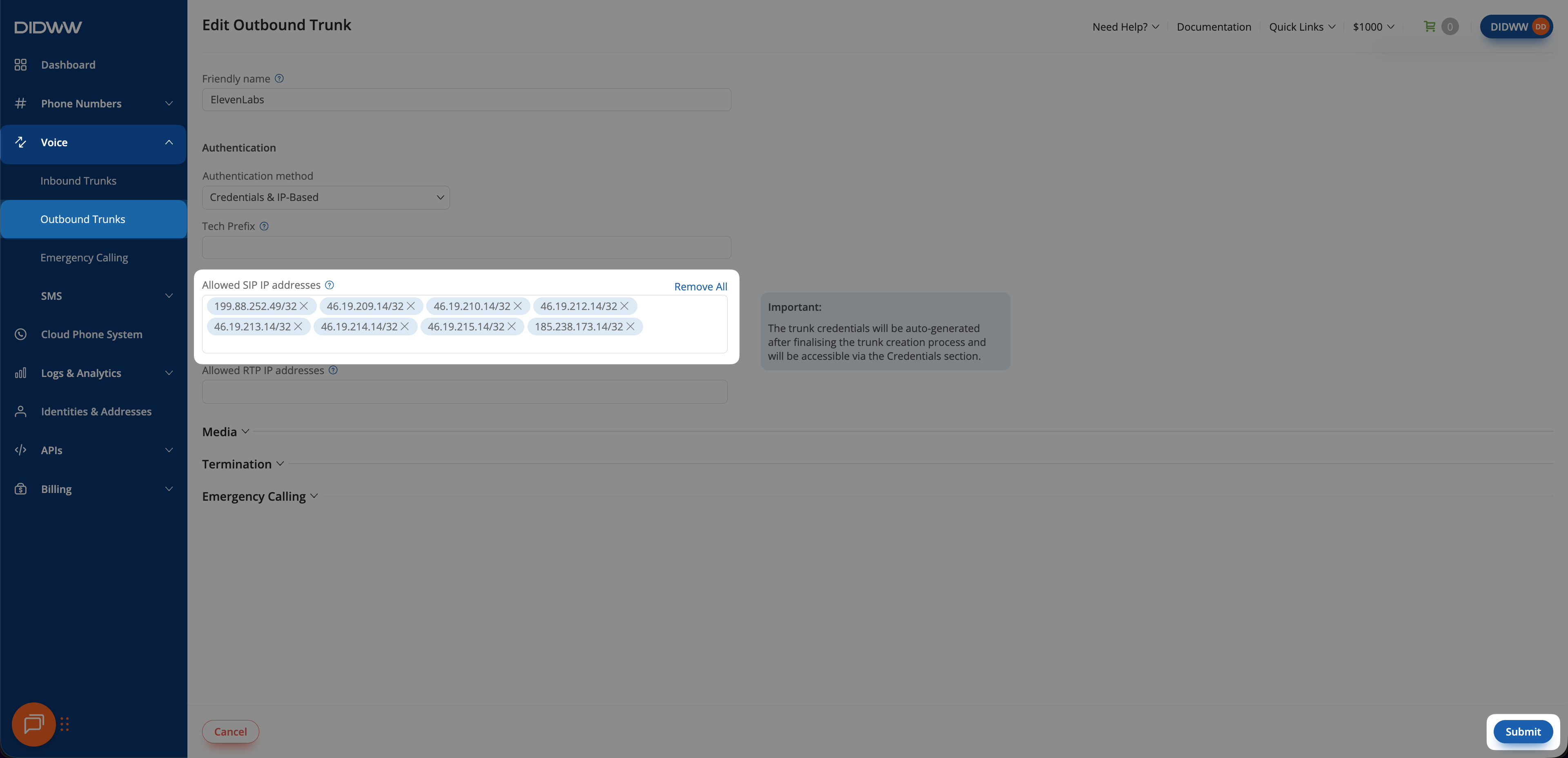 46.19.210.14and IPv62a01:ad00:2:14::14, and ensure the correct ElevenLabs SIP IPs are also included.Click Submit to save the changes.