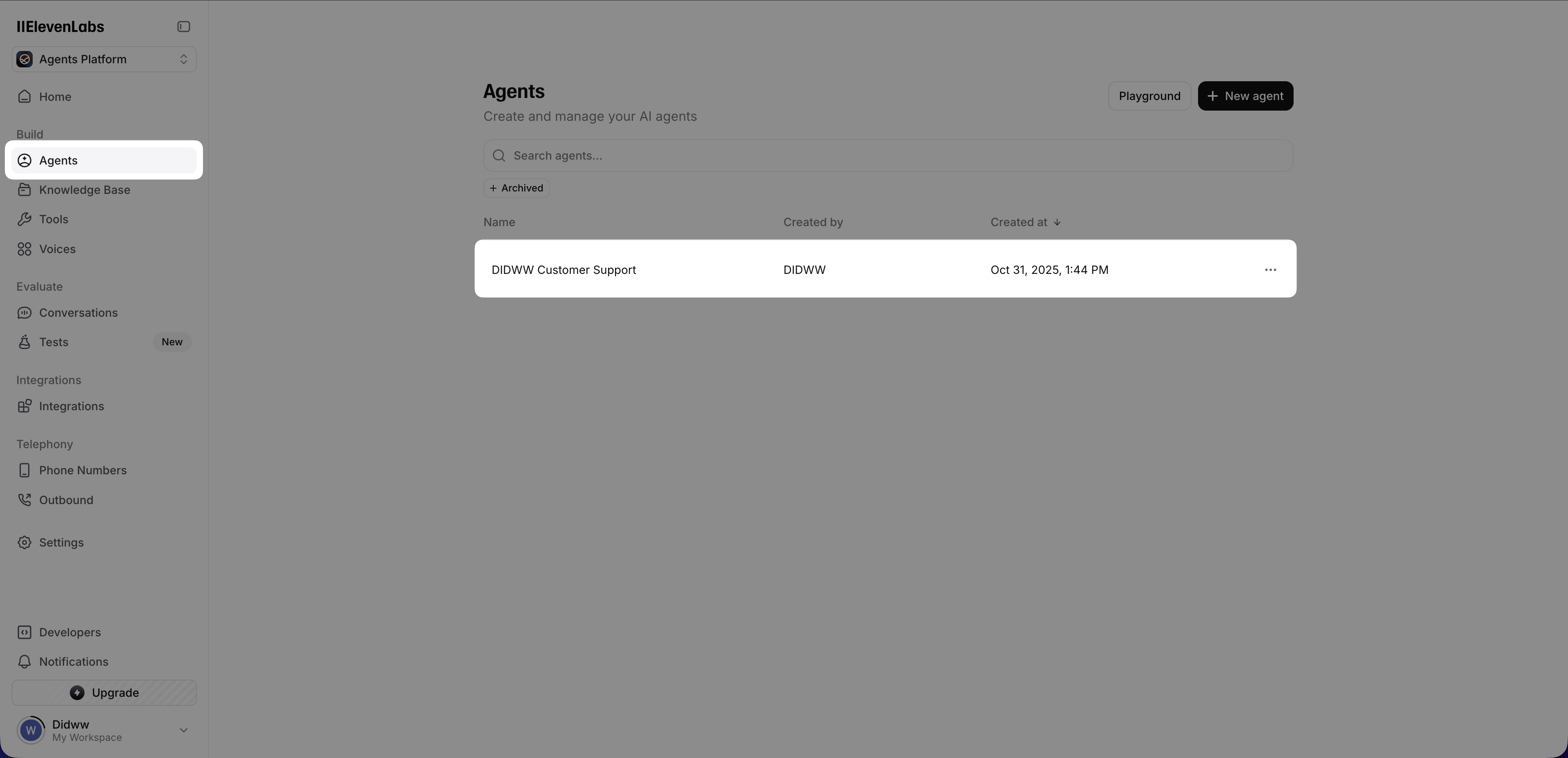 In the ElevenLabs , navigate to Build > Agents and open your Voice Agent.