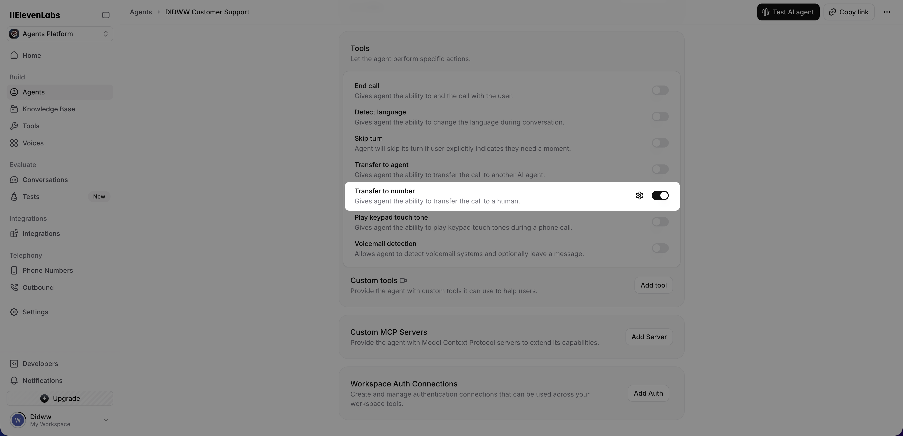 Fig. 13. Enabling the Transfer to number tool in the ElevenLabs Agent configuration
