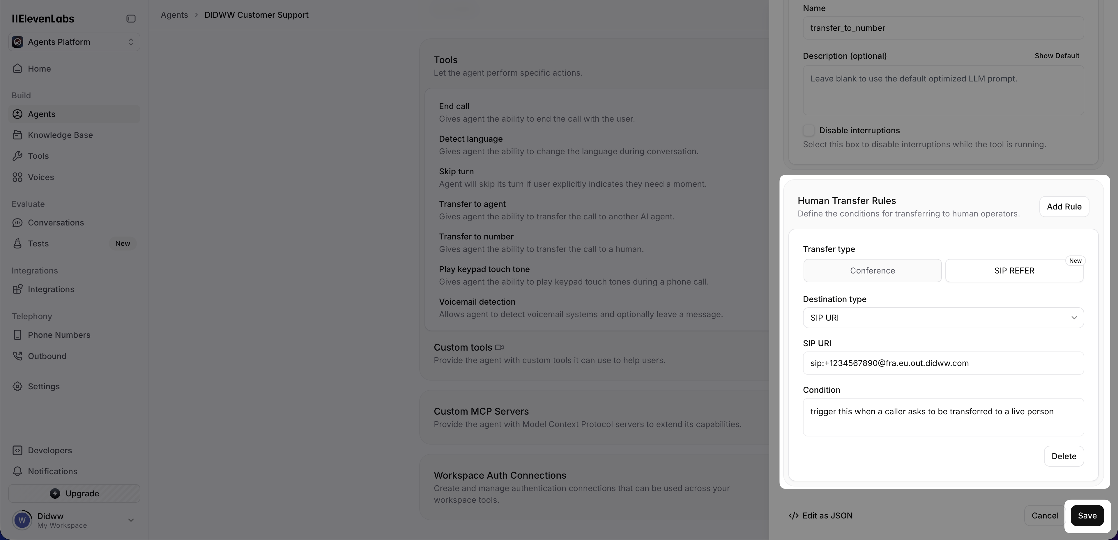 This step is required for successful AI-to-Live Agent call transfers between ElevenLabs and DIDWW.