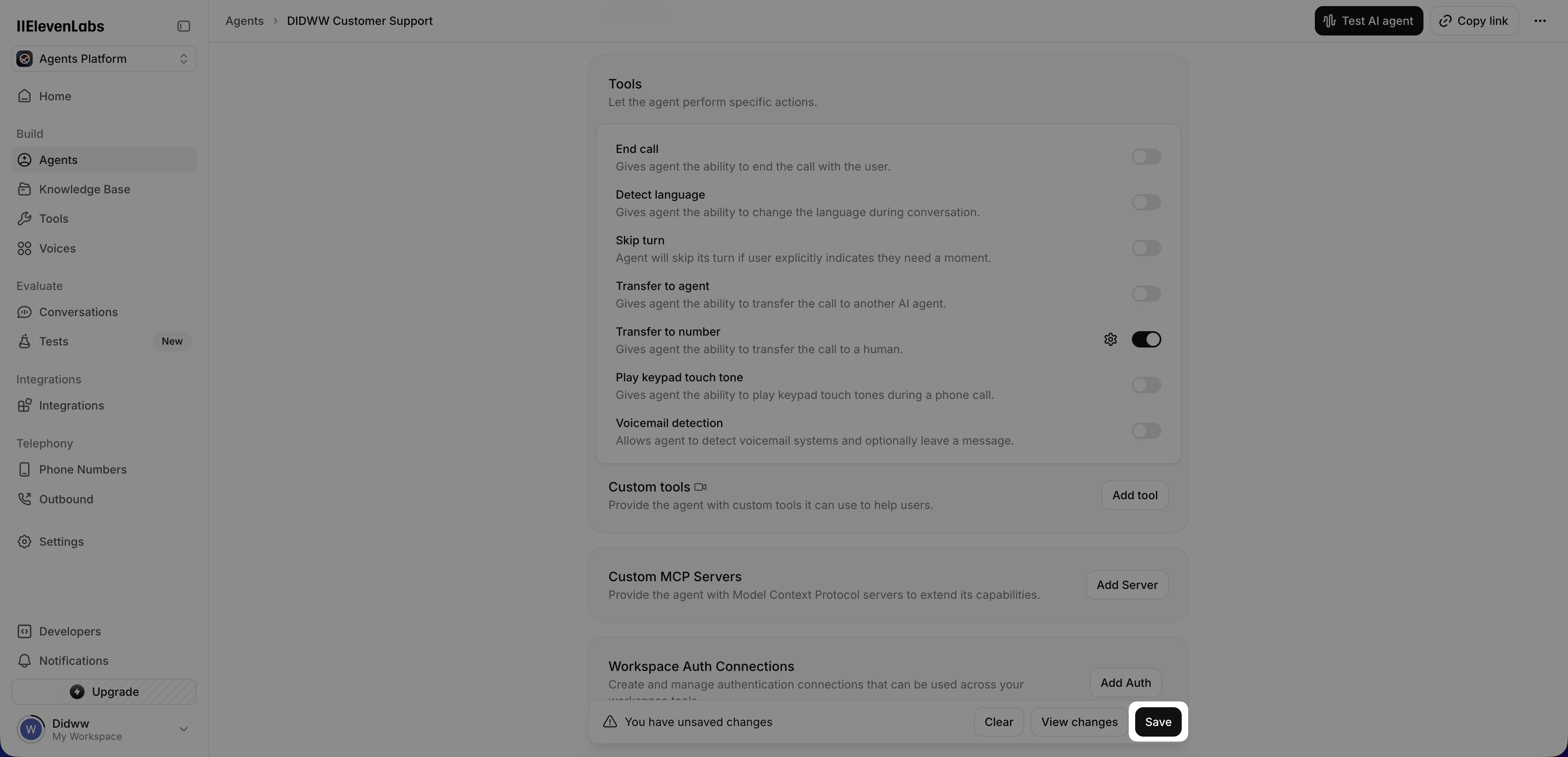 Finally, click Save again on the main Voice Agent page to apply all changes.