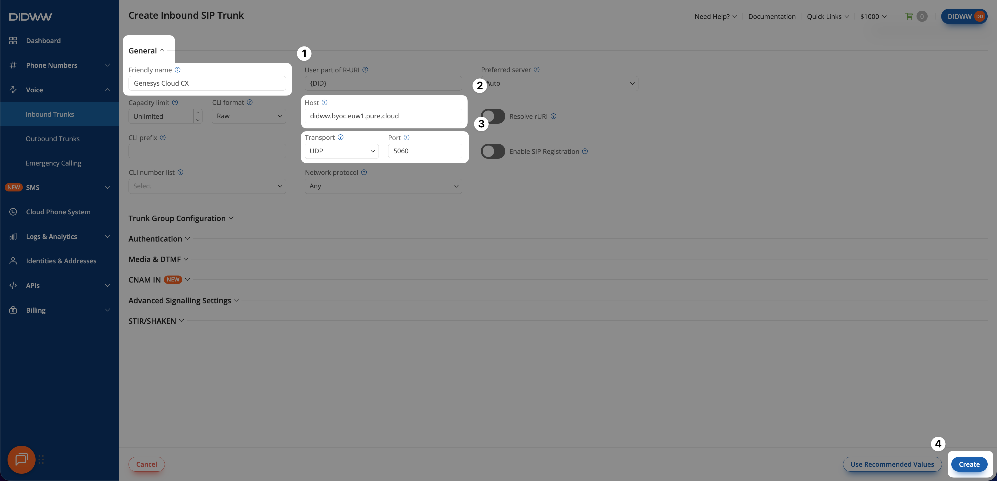 To connect DIDWW with Genesys Cloud CX, first create an Inbound SIP Trunk in the DIDWW User Panel. This trunk defines where DIDWW should send incoming calls.