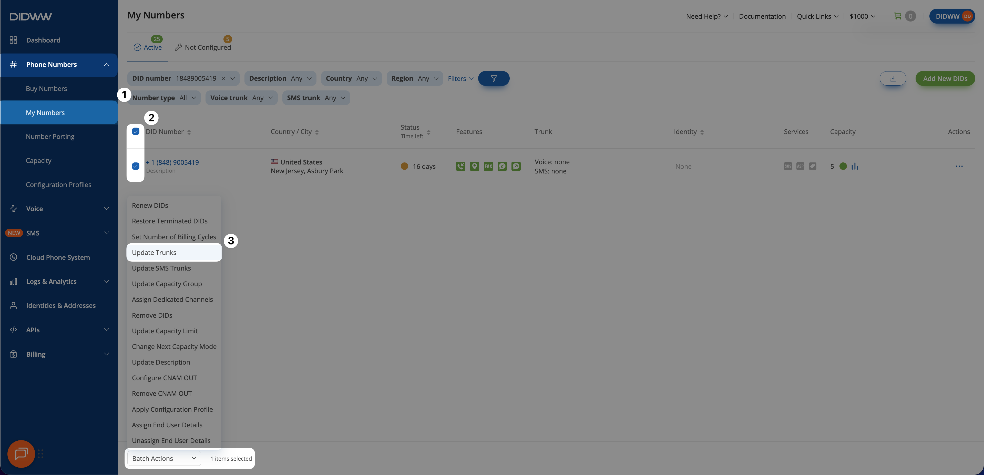Go to Phone Numbers > My Numbers.