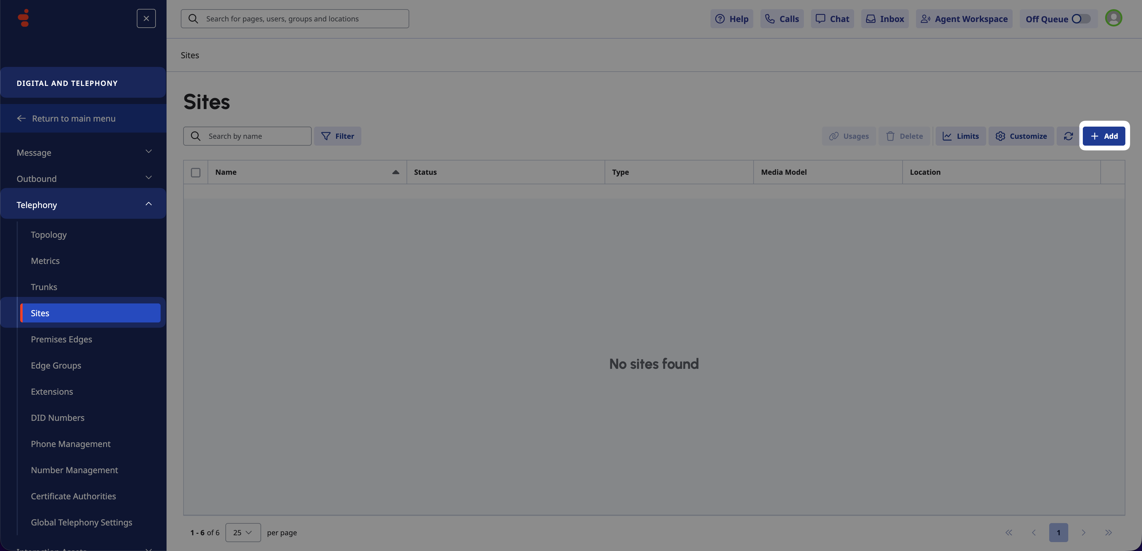 Navigate to Digital and Telephony > Telephony > Sites.