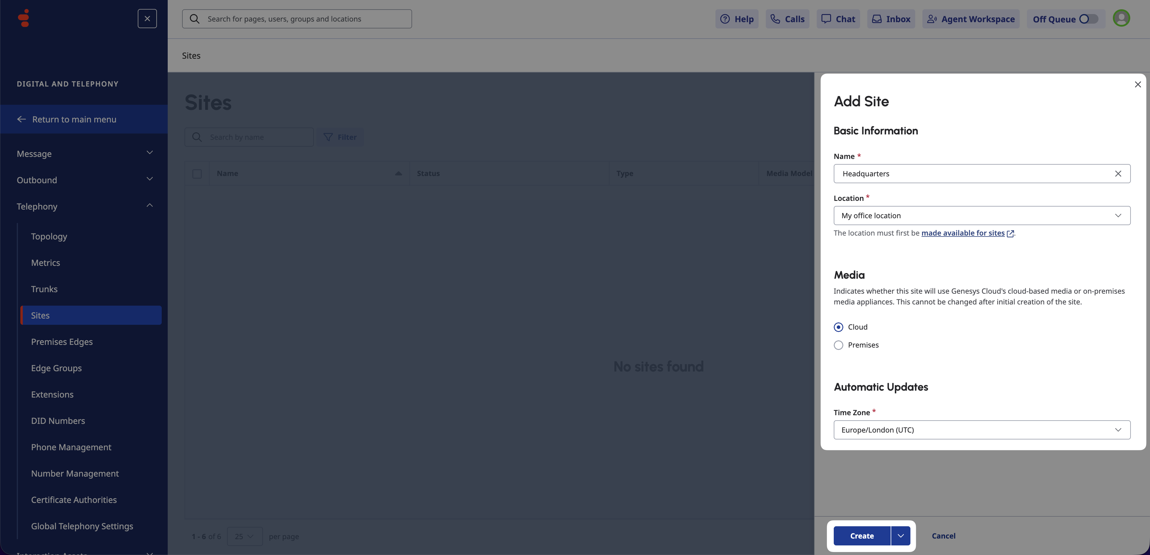 A Site in Genesys Cloud CX defines the telephony properties and routing rules for a location. You must create a Site before assigning Trunks to it.
