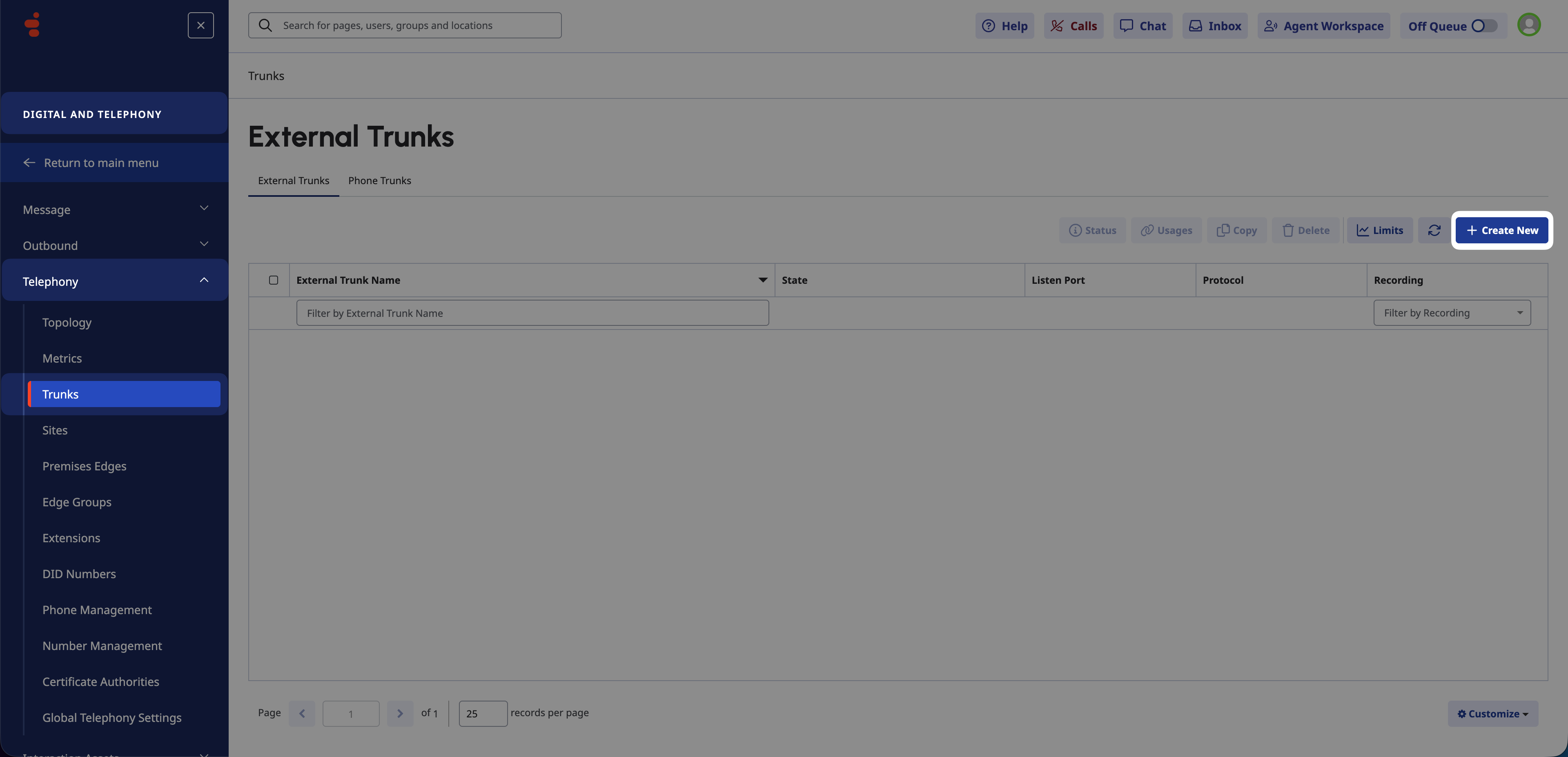 Go to Digital and Telephony > Telephony > Trunks.