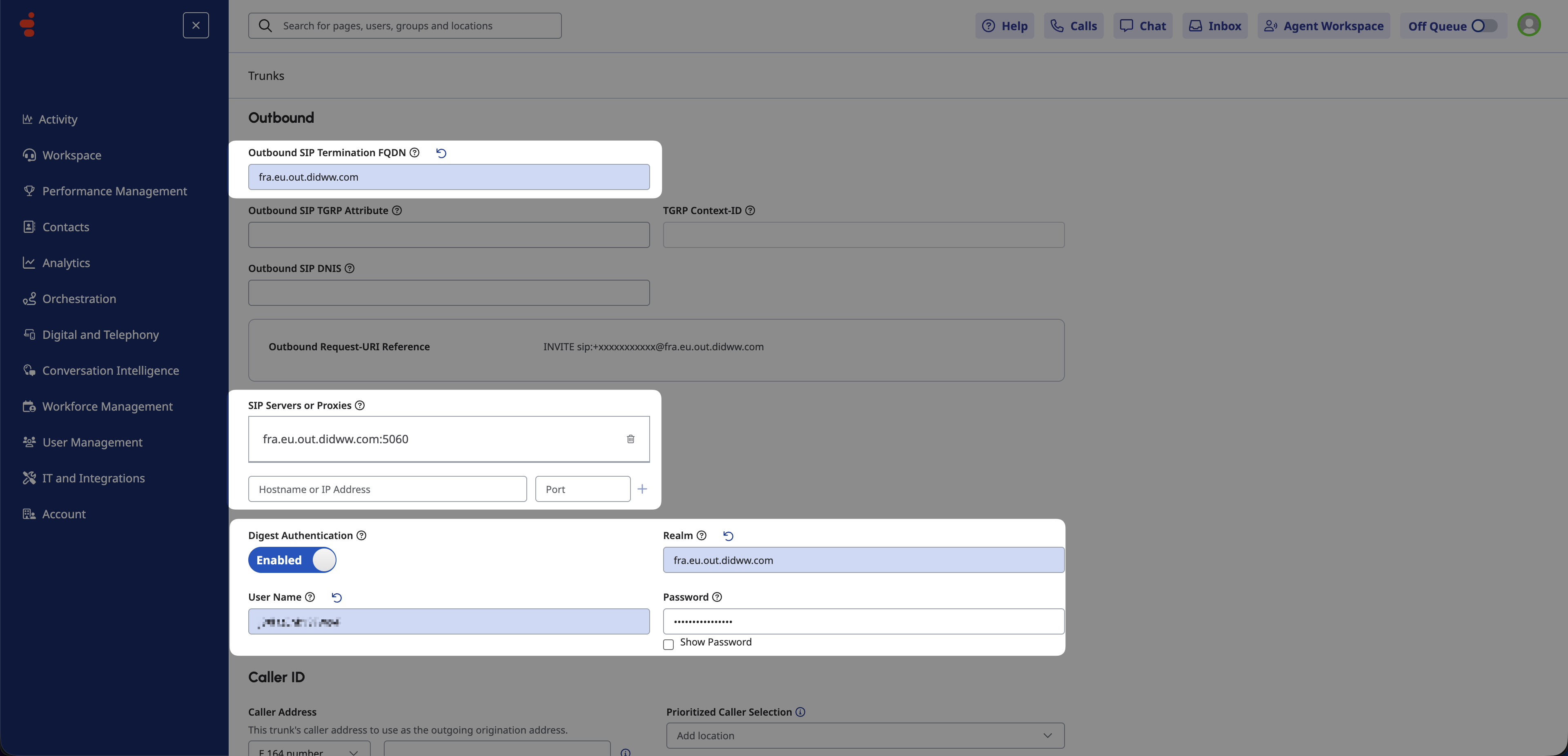 fra.eu.out.didww.com).Enter the User Name and Password obtained from the DIDWW Outbound Trunk in Step 3: Retrieve Credentials.