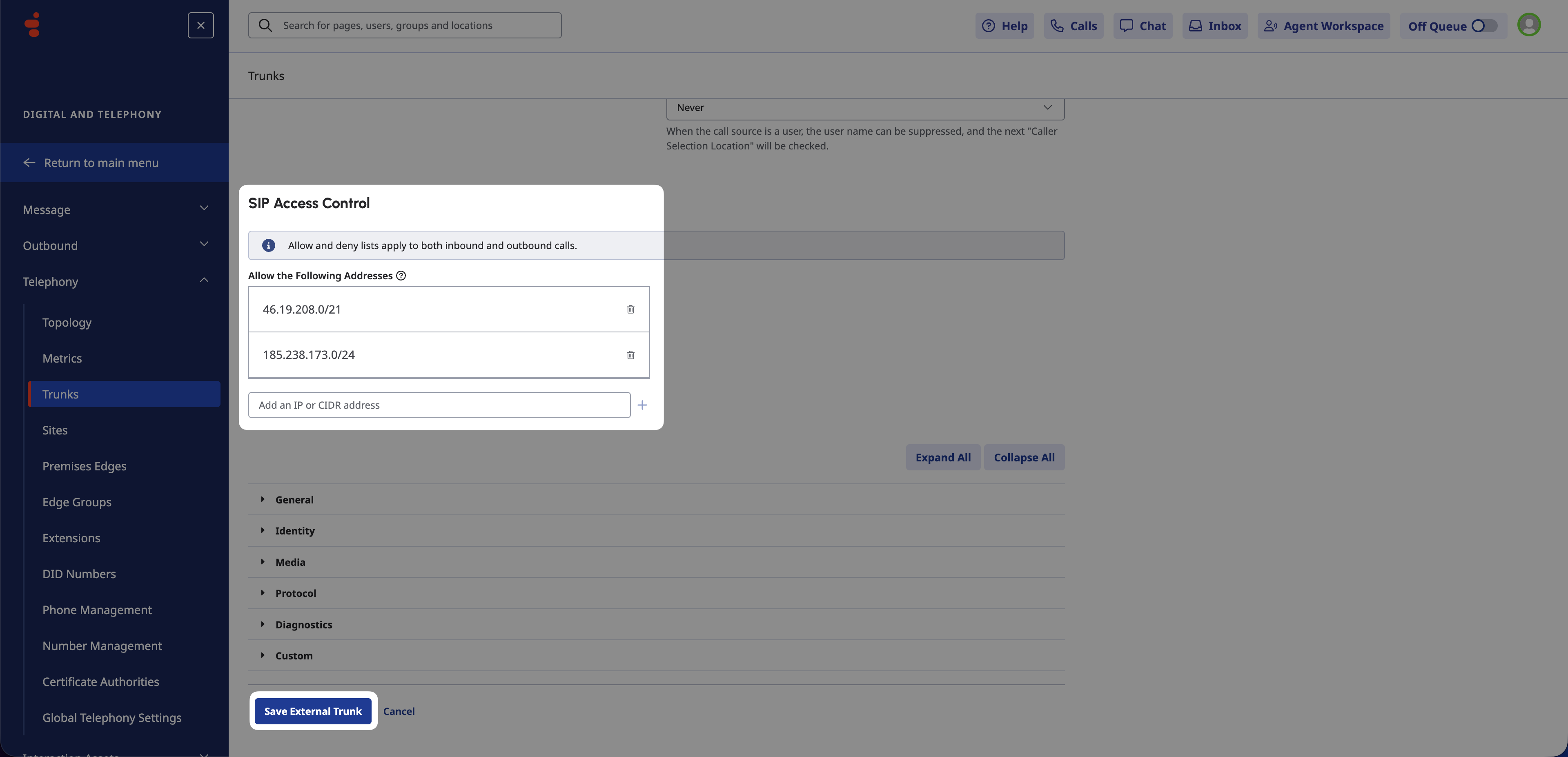 Genesys Outbound).In Allowed SIP IP addresses, add the Genesys BYOC Cloud IPs for your region.