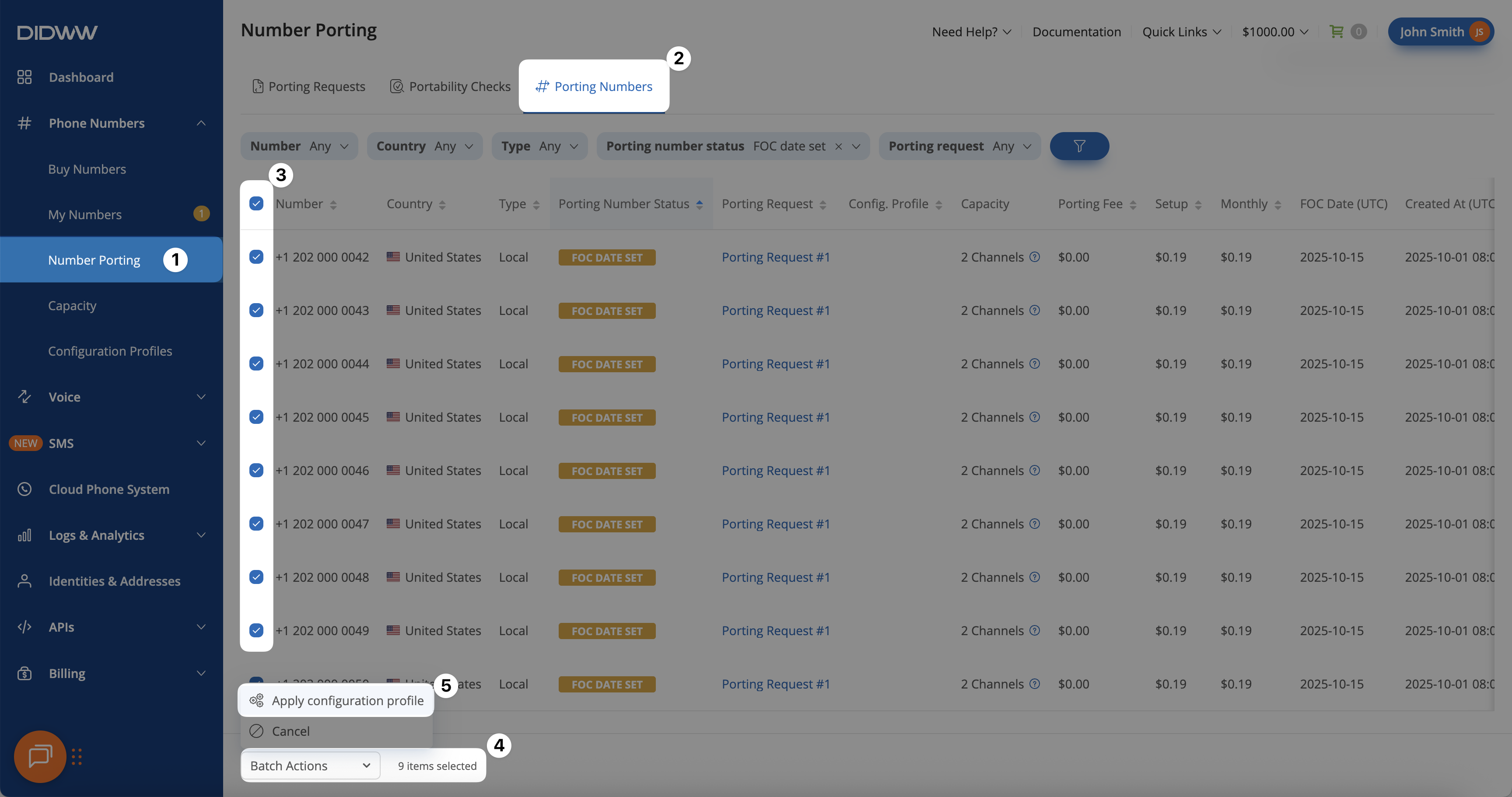 Apply a Configuration Profile to multiple porting numbers at once using the Batch Actions menu. This ensures that your numbers are automatically assigned to the correct routing and capacity setup once they are successfully ported.