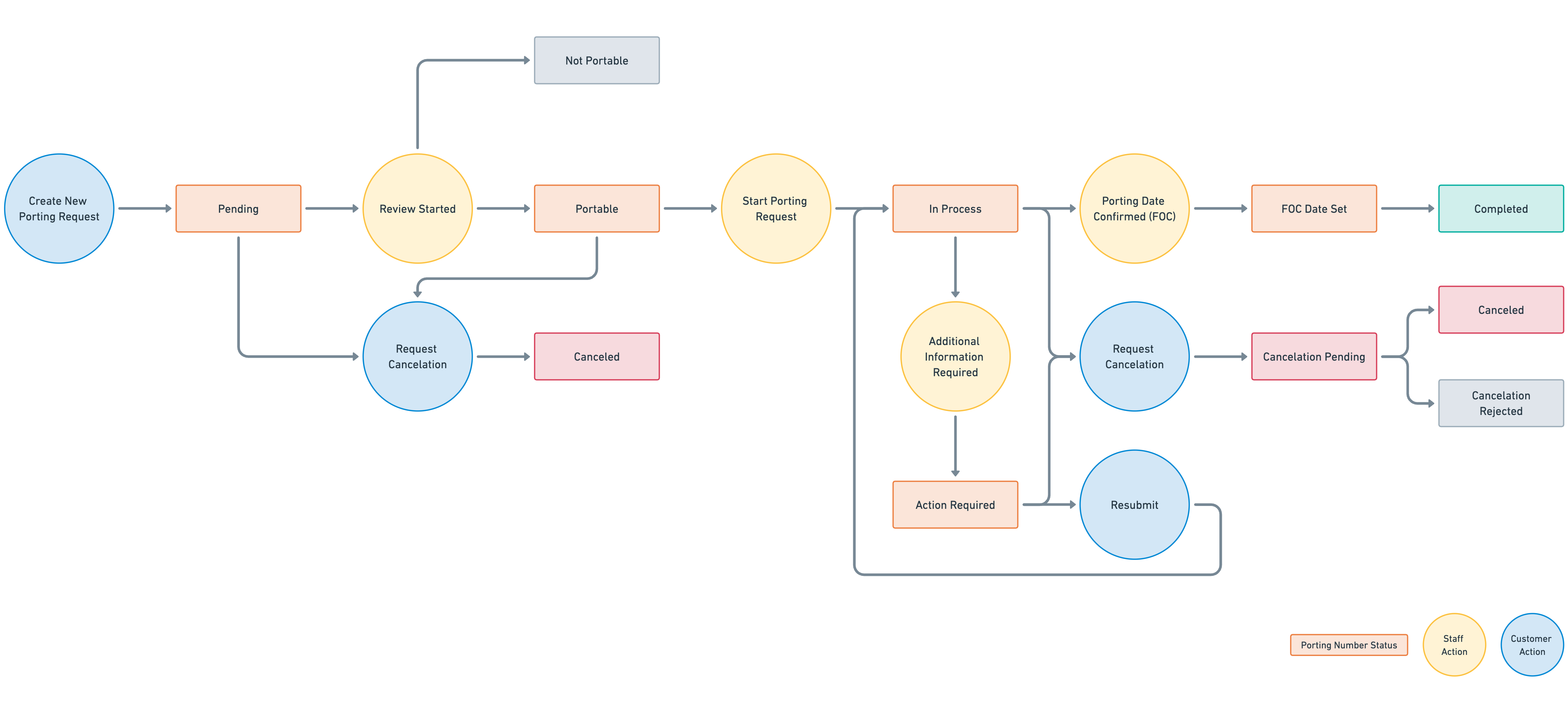 This flow shows how porting numbers move through different stages within a porting request, starting from creation and review, and ending with processing, cancellation, or completion.