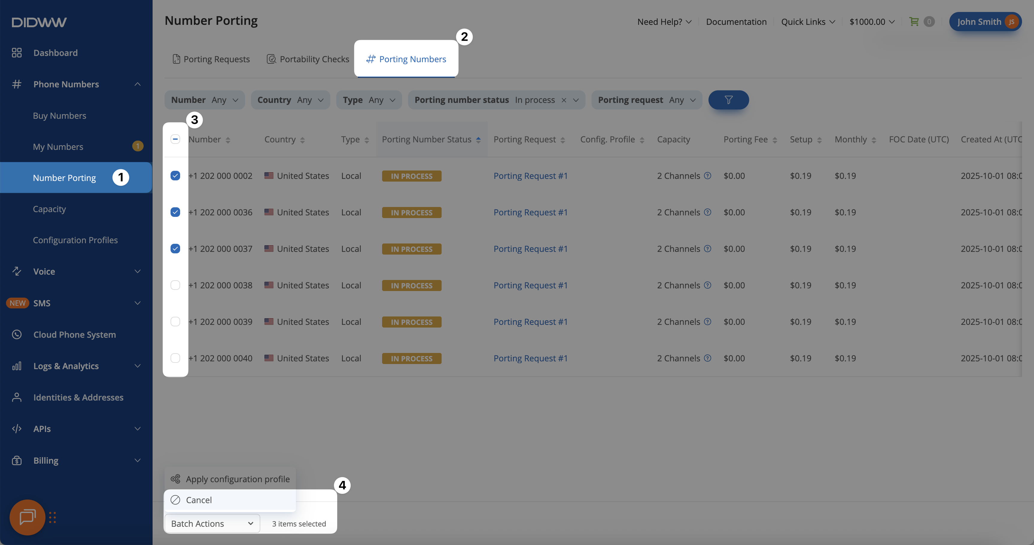 Request the cancellation of selected numbers within an active porting request using the Batch Actions menu. This option is useful if you no longer want to proceed with porting specific numbers, without canceling the entire porting request.