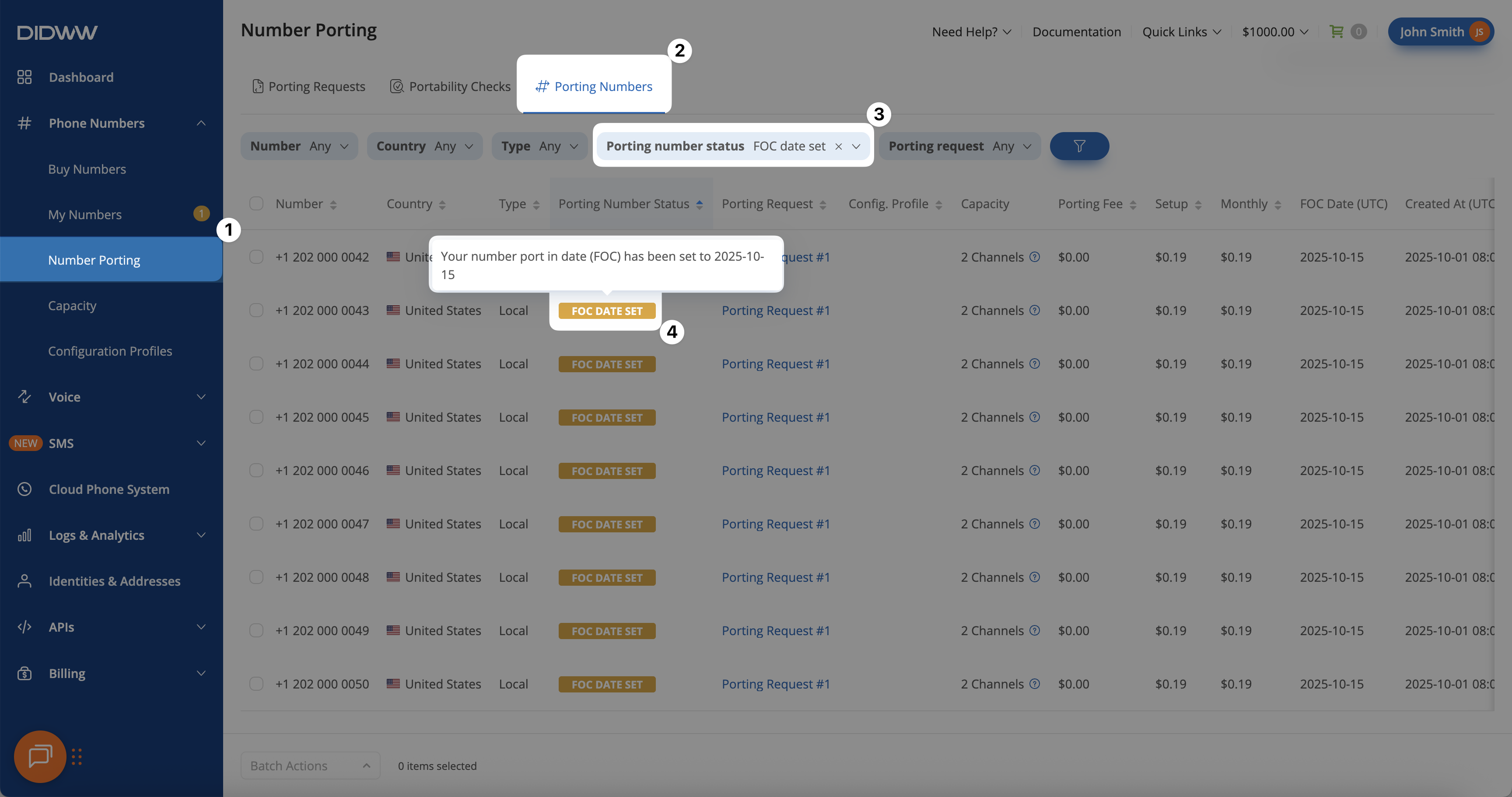 Use the Porting Number Status filter and select FOC Date Set to display only numbers with a confirmed porting date.