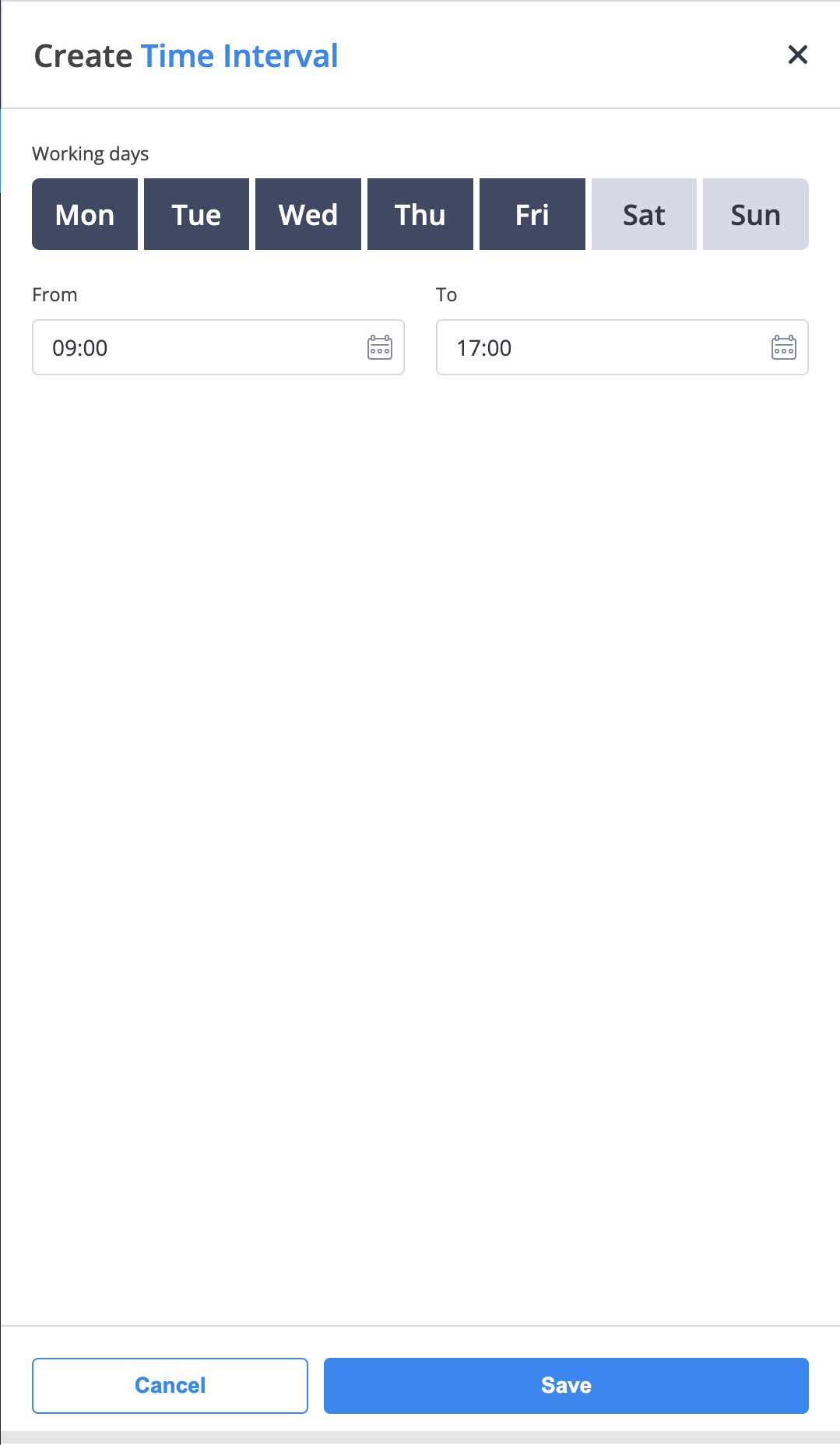 For example, you can define intervals for Monday–Friday 09:00–17:00 and Saturday 09:00–13:00, both routing calls to the Yes destination.