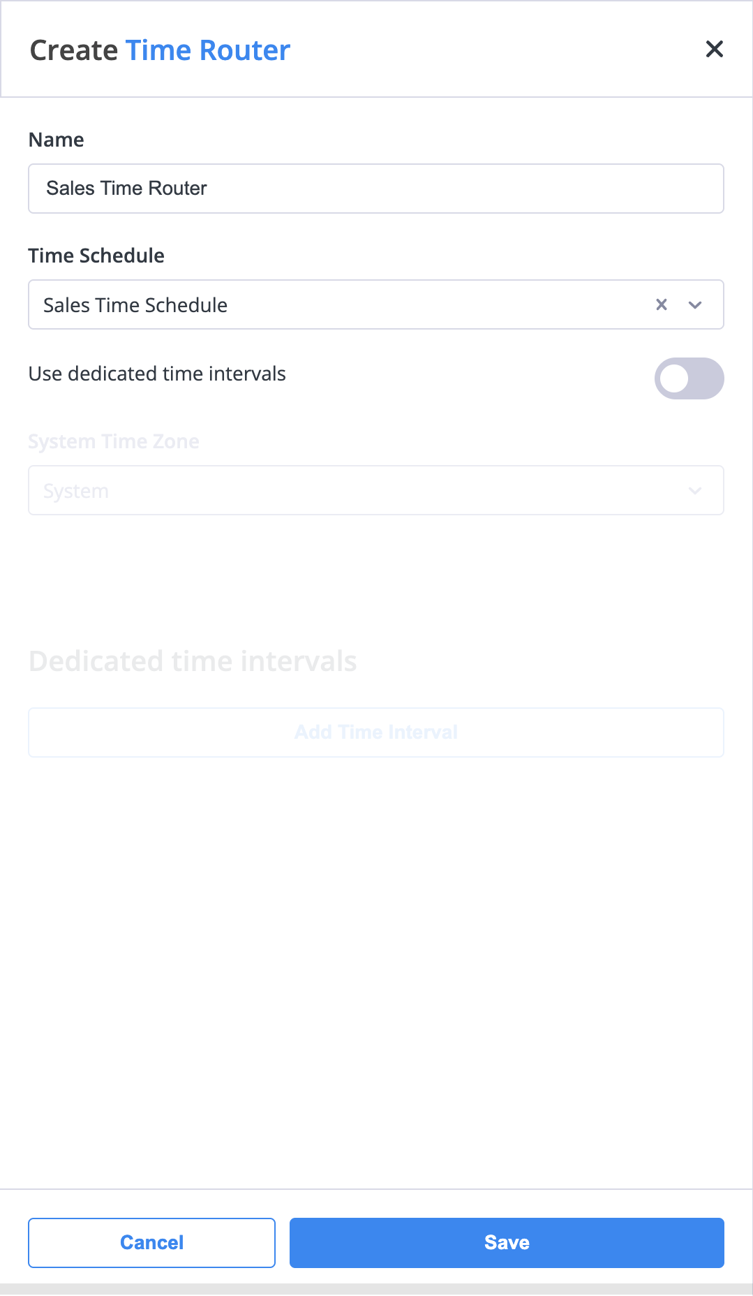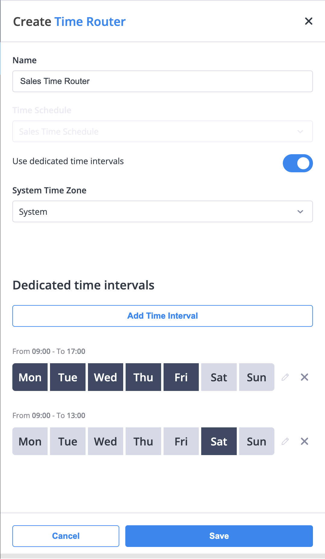 Enable the Use dedicated time intervals toggle to manually define specific day and time conditions directly within the Time Router.