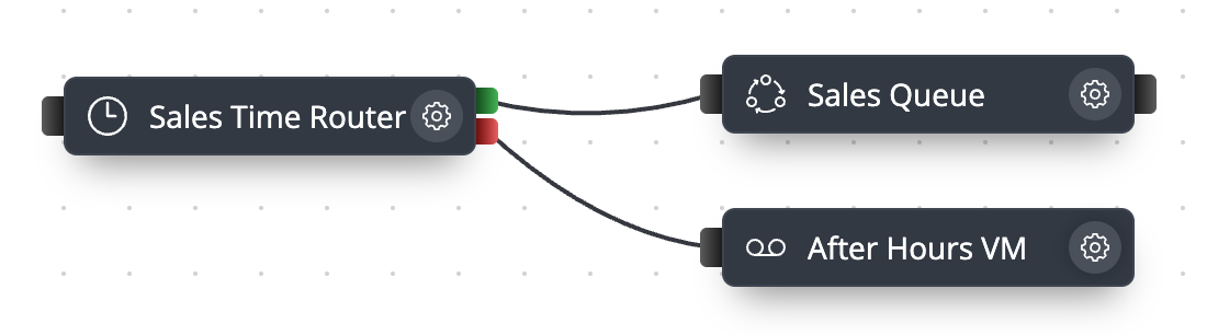 In the example below, if incoming calls are received within the configured business hours, they are forwarded to the Sales Queue. Otherwise, calls are directed to the Voicemail object, where an after-hours message is played.