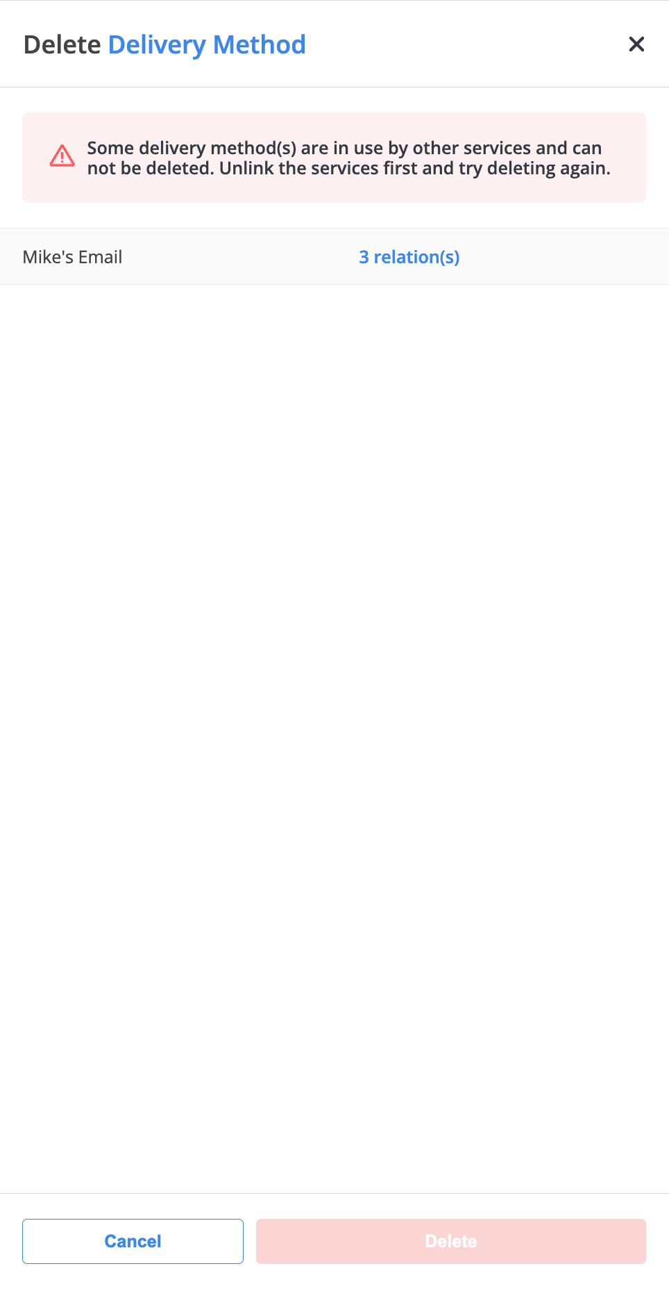 Before deletion can proceed, all related services must be unlinked. Once the relations are removed, click Delete to permanently delete the delivery method.