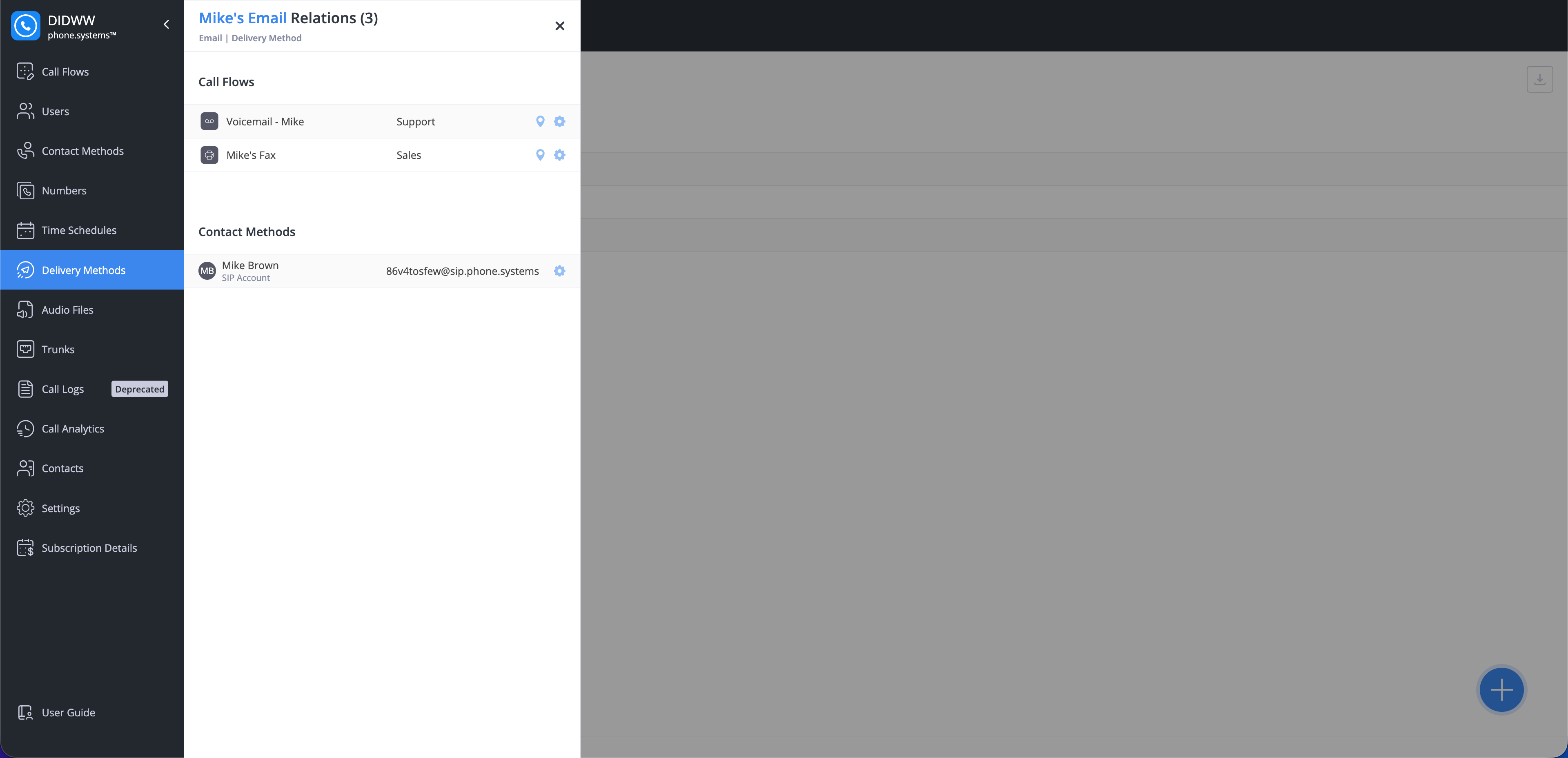 The Relations shows which phone.systems™ objects use a specific delivery method. Review dependencies and adjust settings if needed to prevent service interruptions before editing or deleting a method.