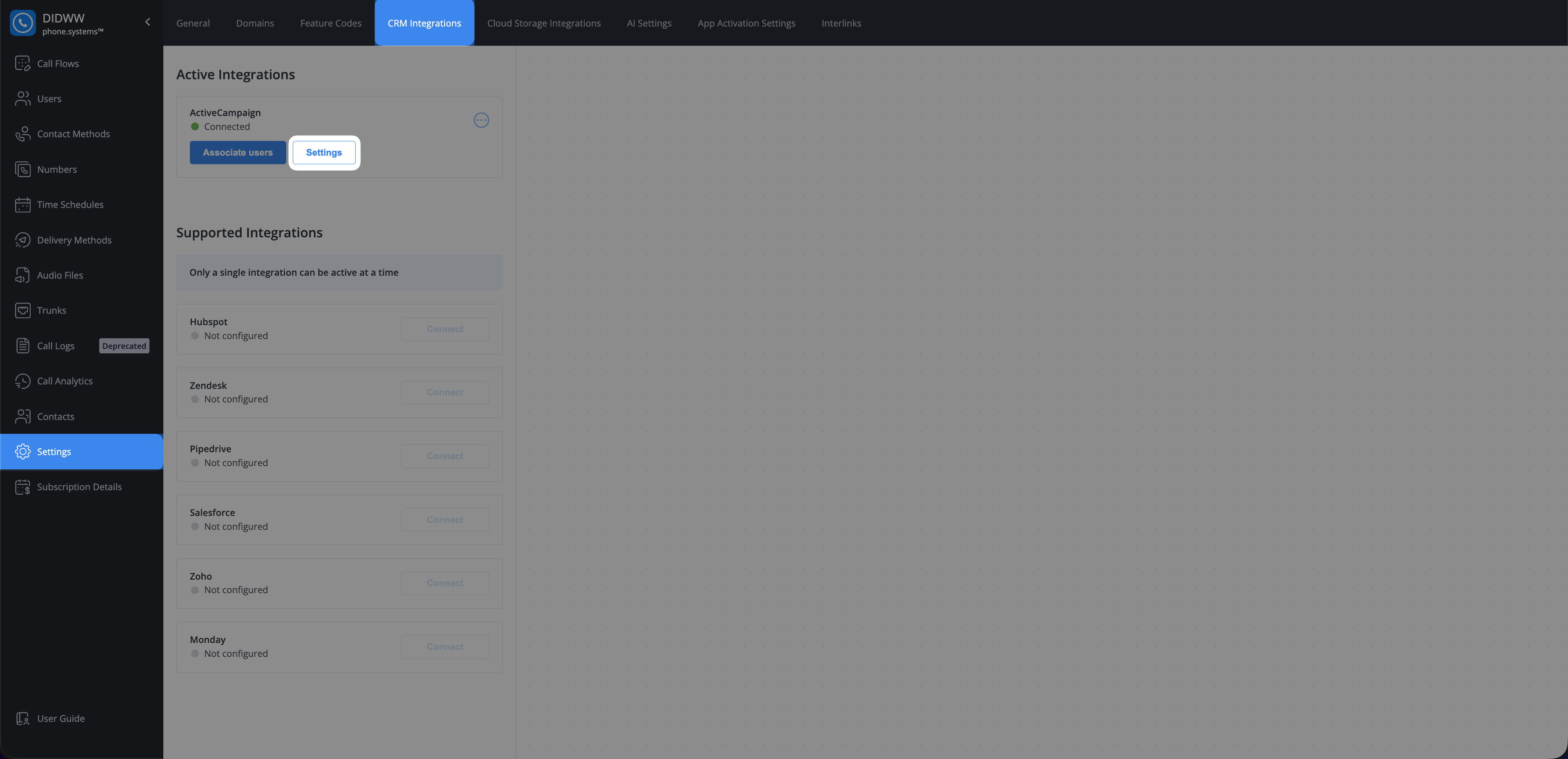 In phone.systems™ go to Settings, then open CRM Integrations.