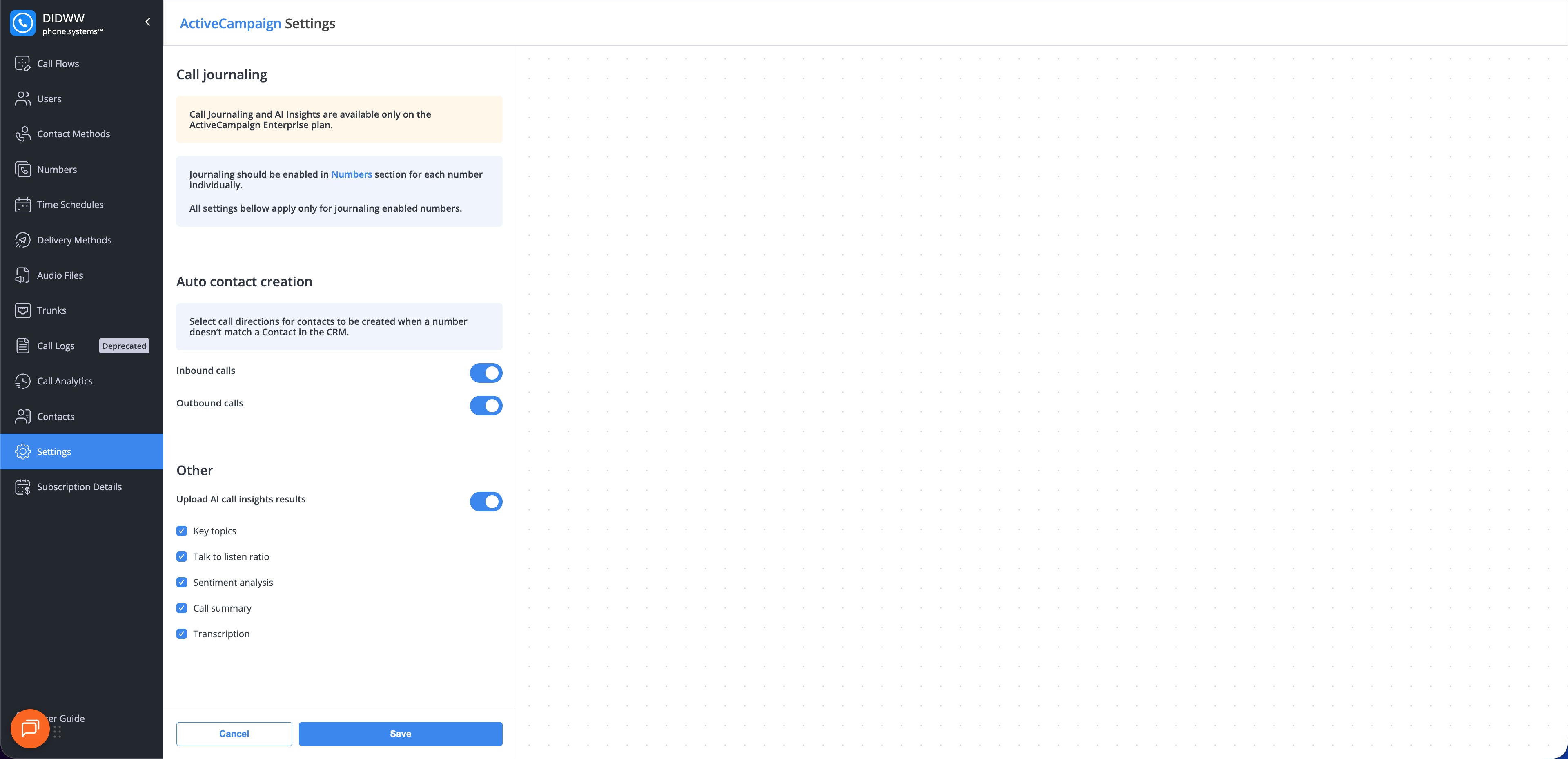 Call journaling for ActiveCampaign is available only on the ActiveCampaign Enterprise plan.