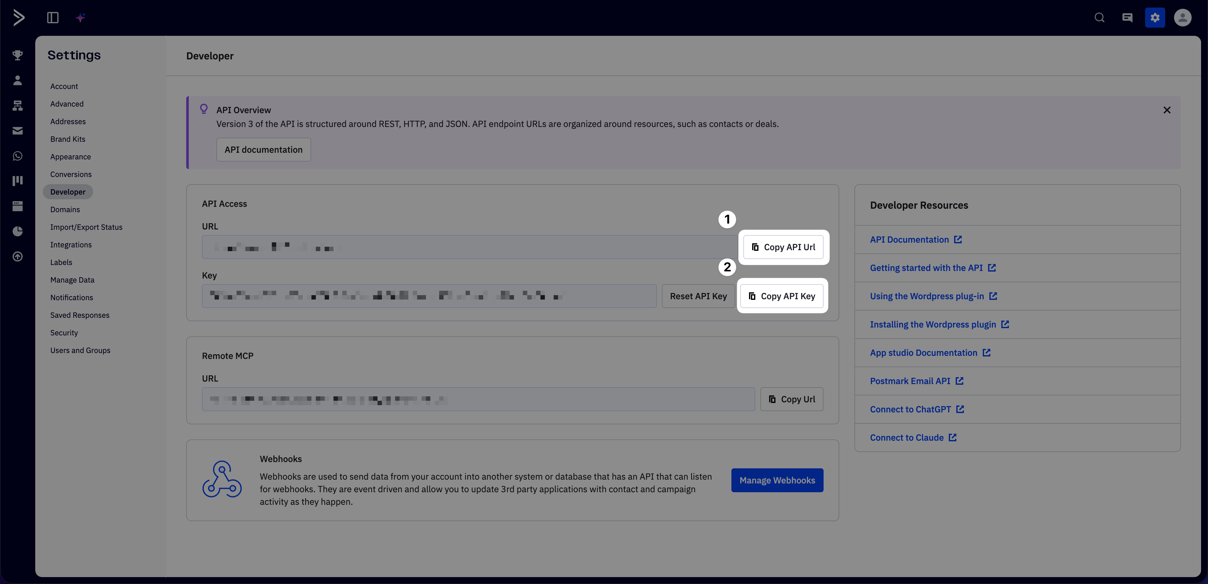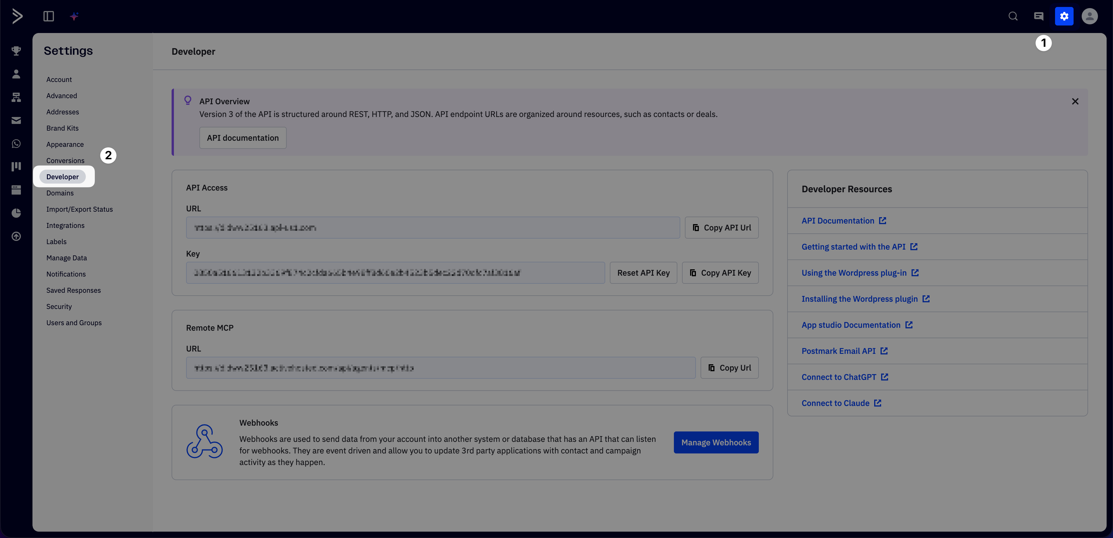 Step 2: Open Developer settings in ActiveCampaign