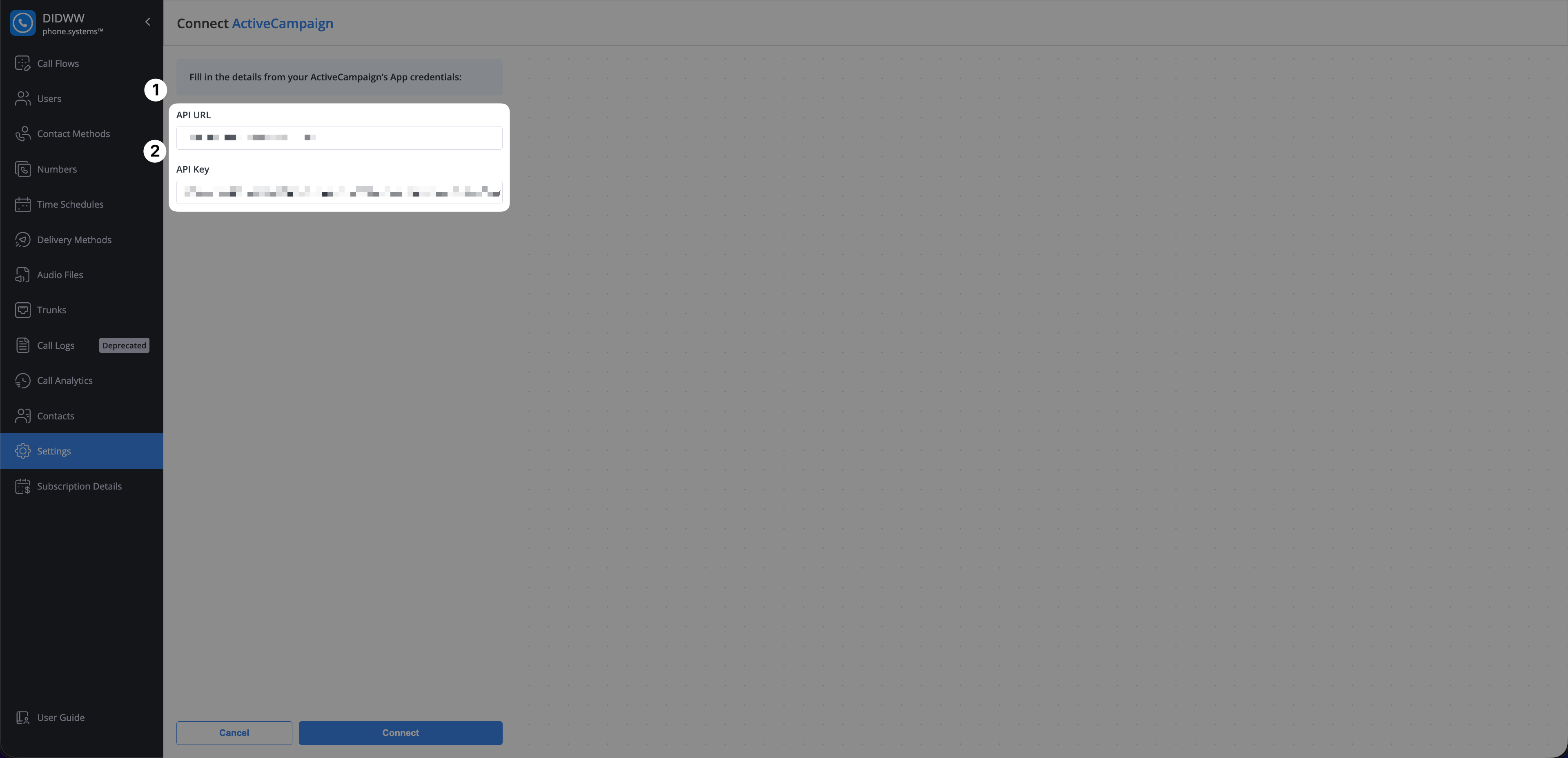 Fig. 5. Connect your ActiveCampaign to phone.systems™