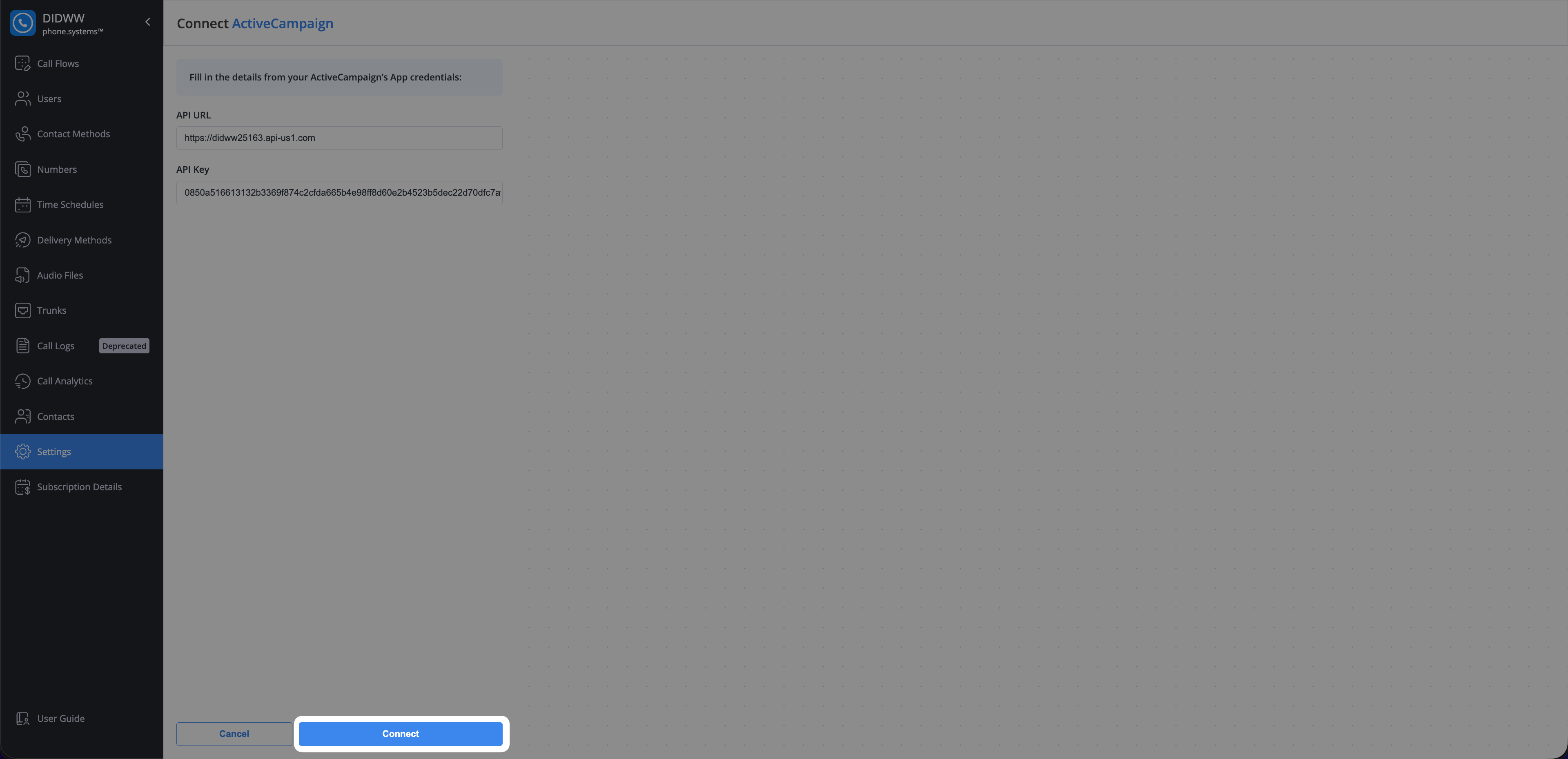 Click Connect to link your ActiveCampaign with phone.systems™.