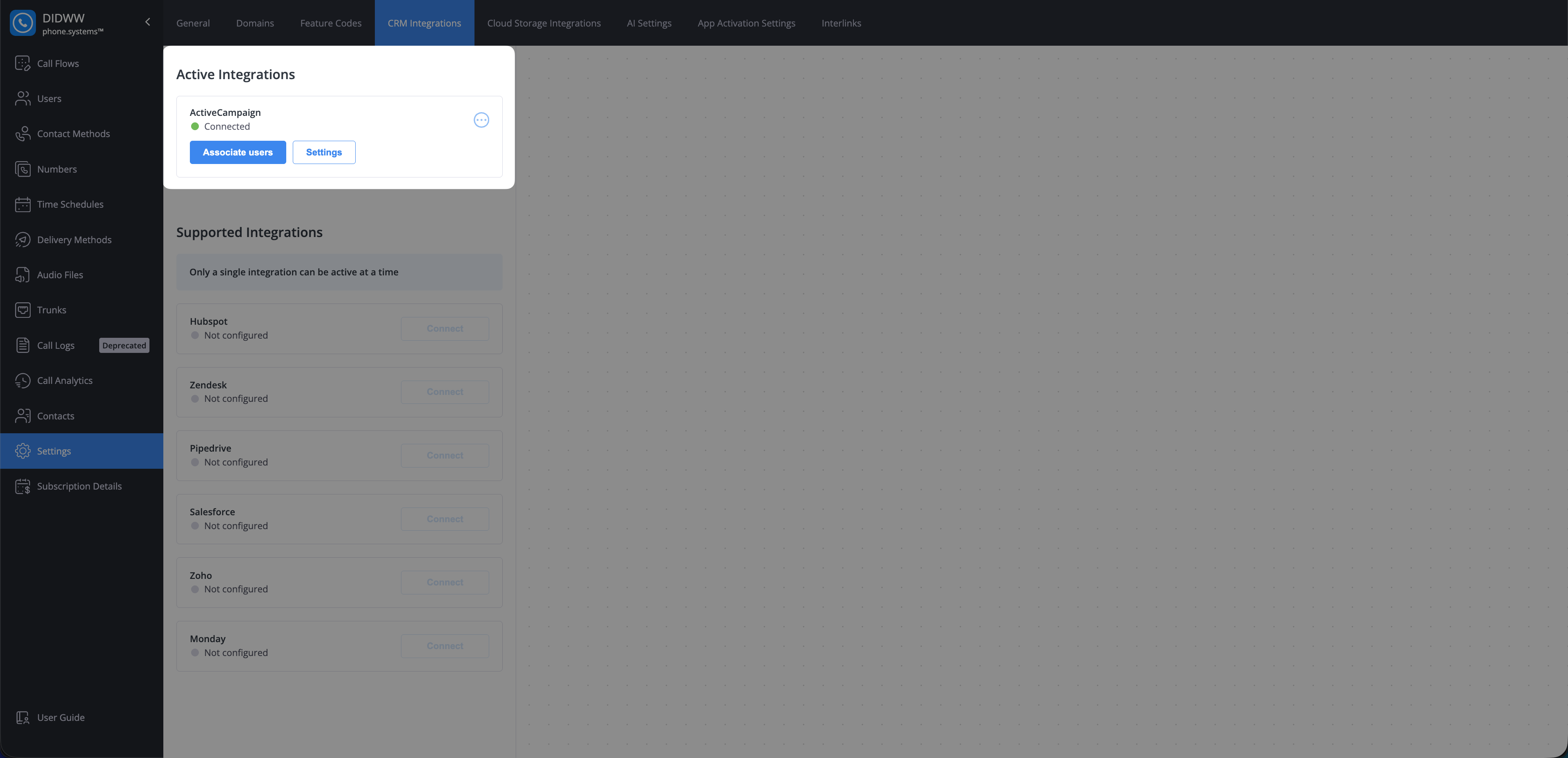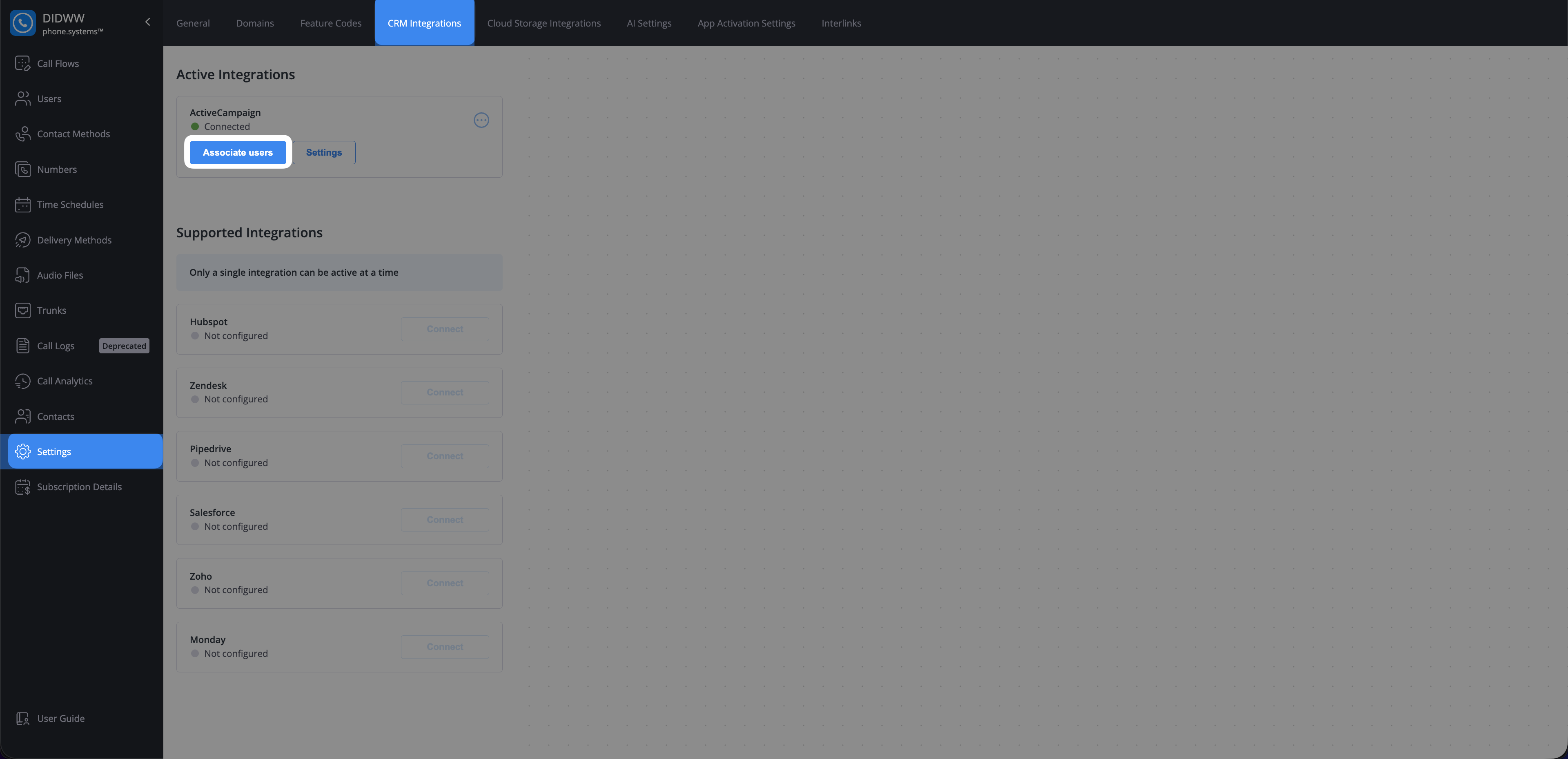 After the ActiveCampaign integration is successfully connected, you can associate ActiveCampaign users with their corresponding phone.systems™ users.
