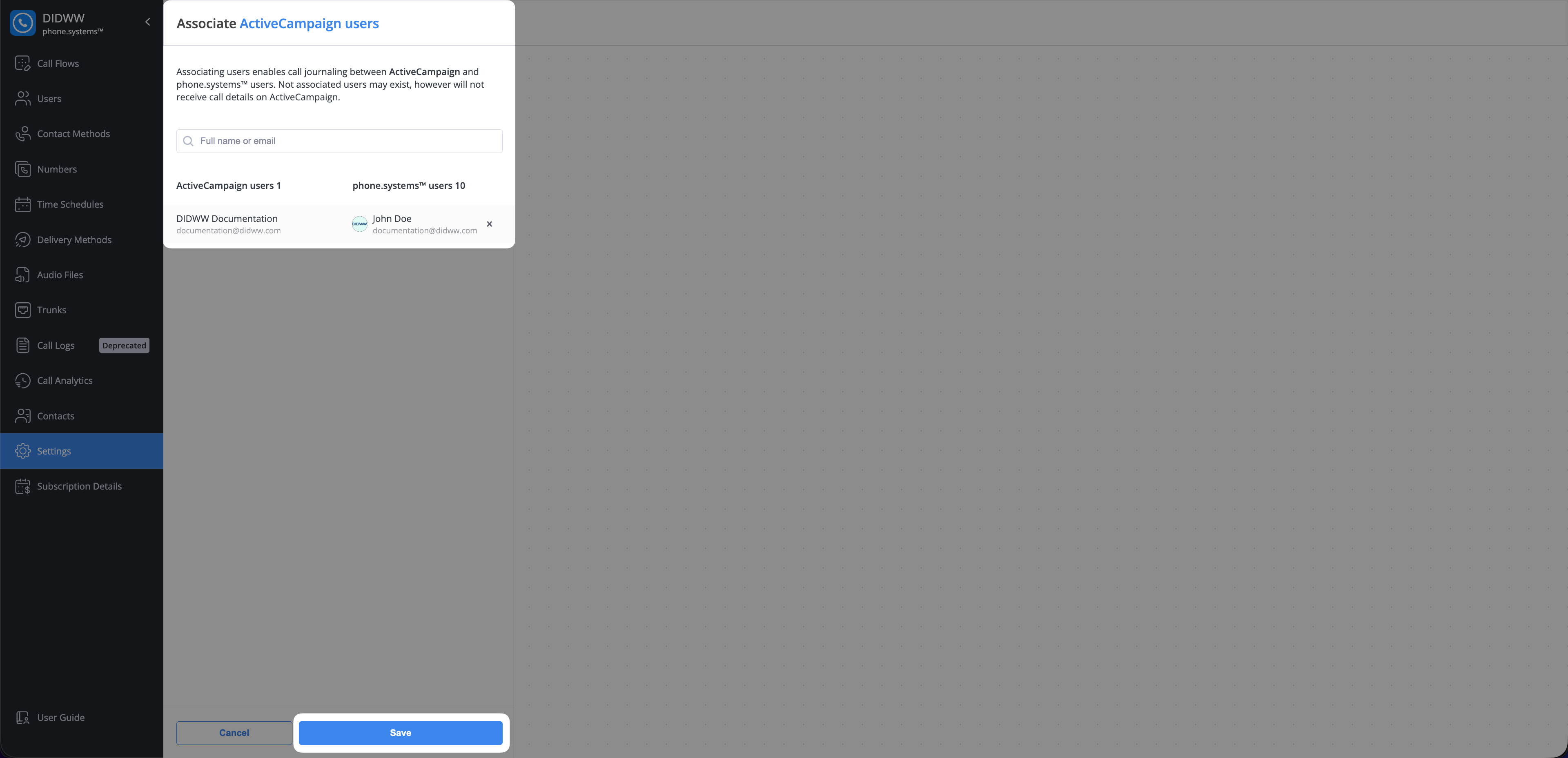After clicking Settings, a dialog opens where you can link ActiveCampaign users with corresponding phone.systems™ users.