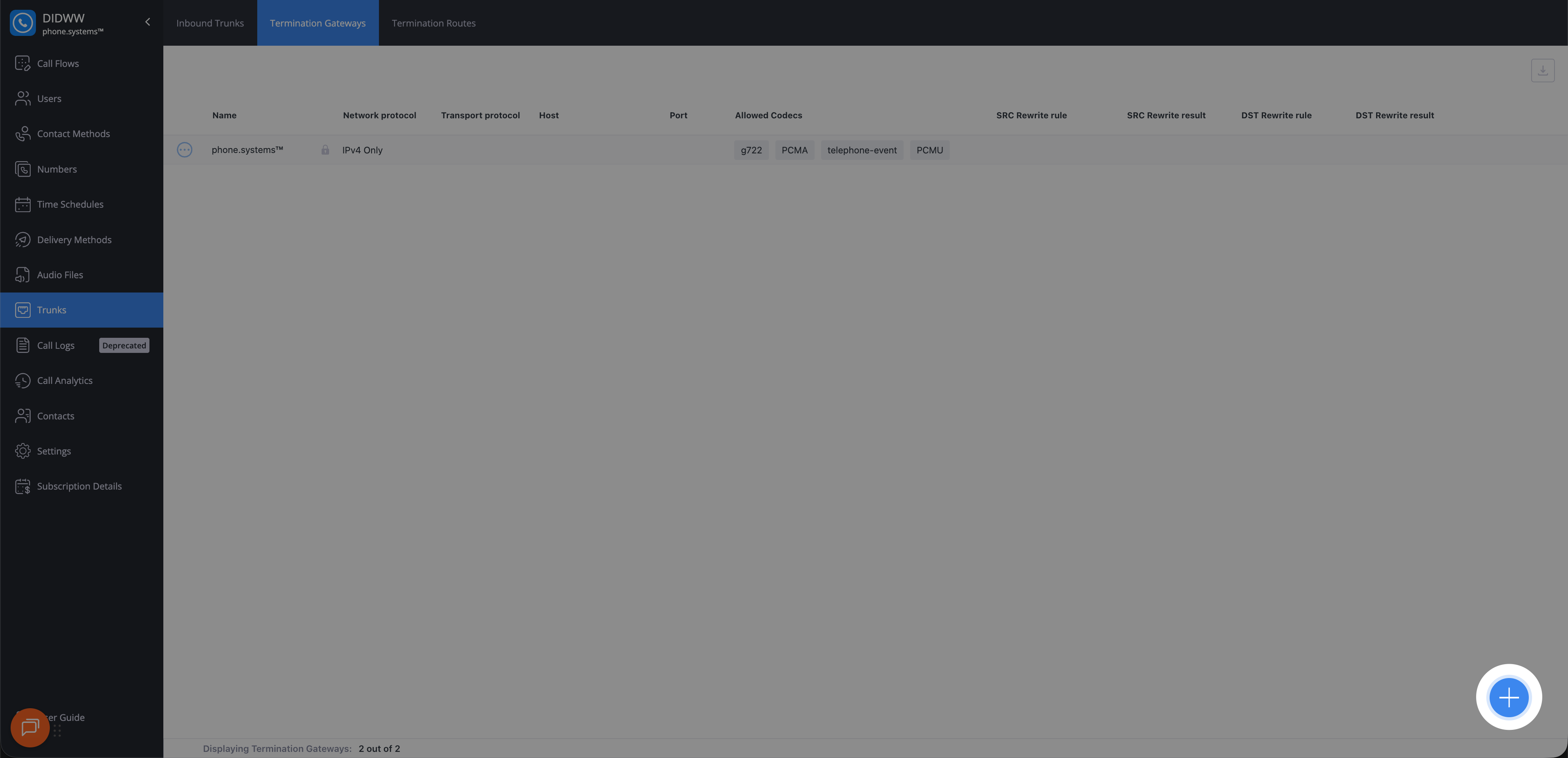 To access and manage termination gateways, click Trunks in the sidebar menu and select the Termination Gateways tab.