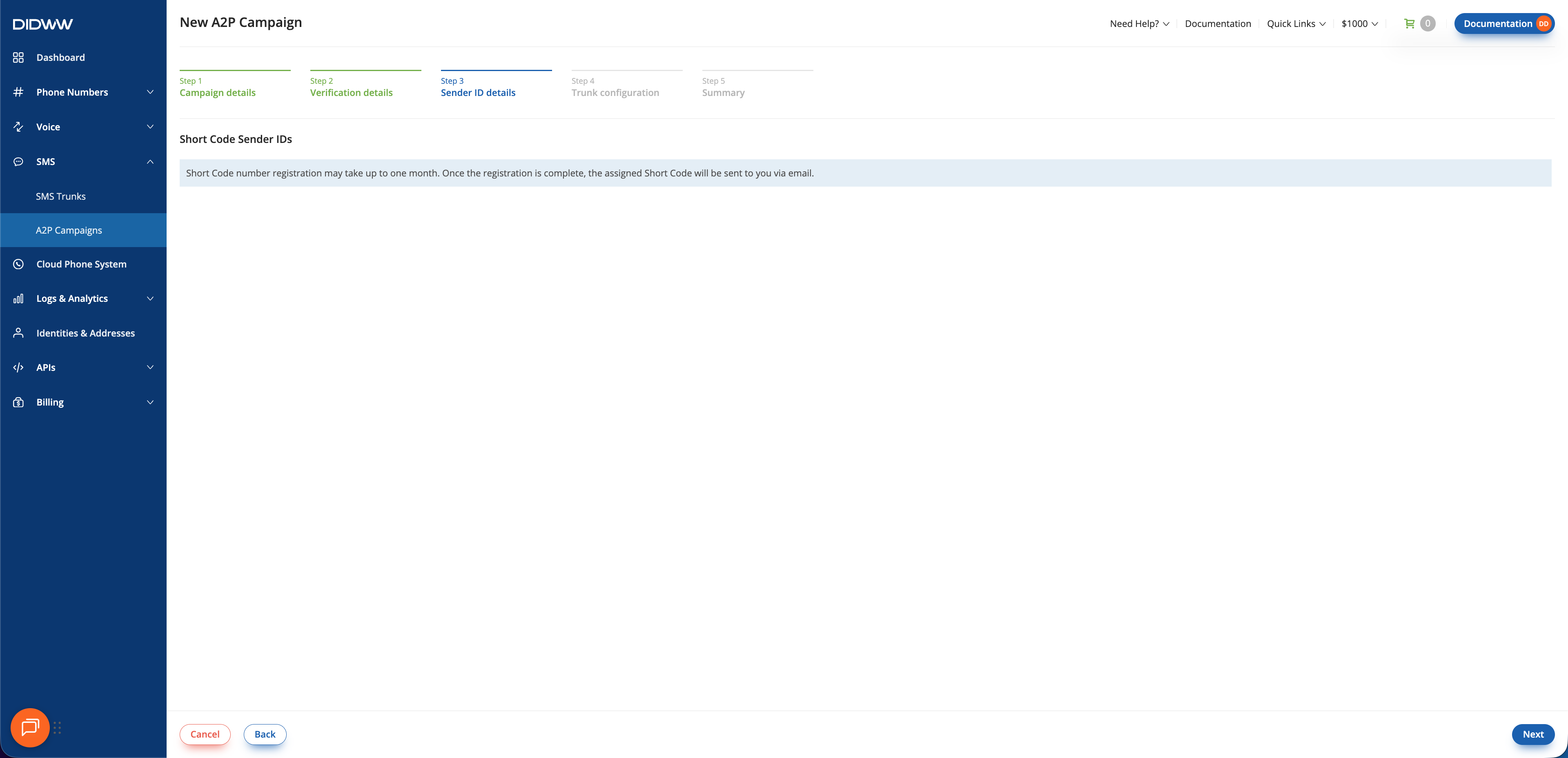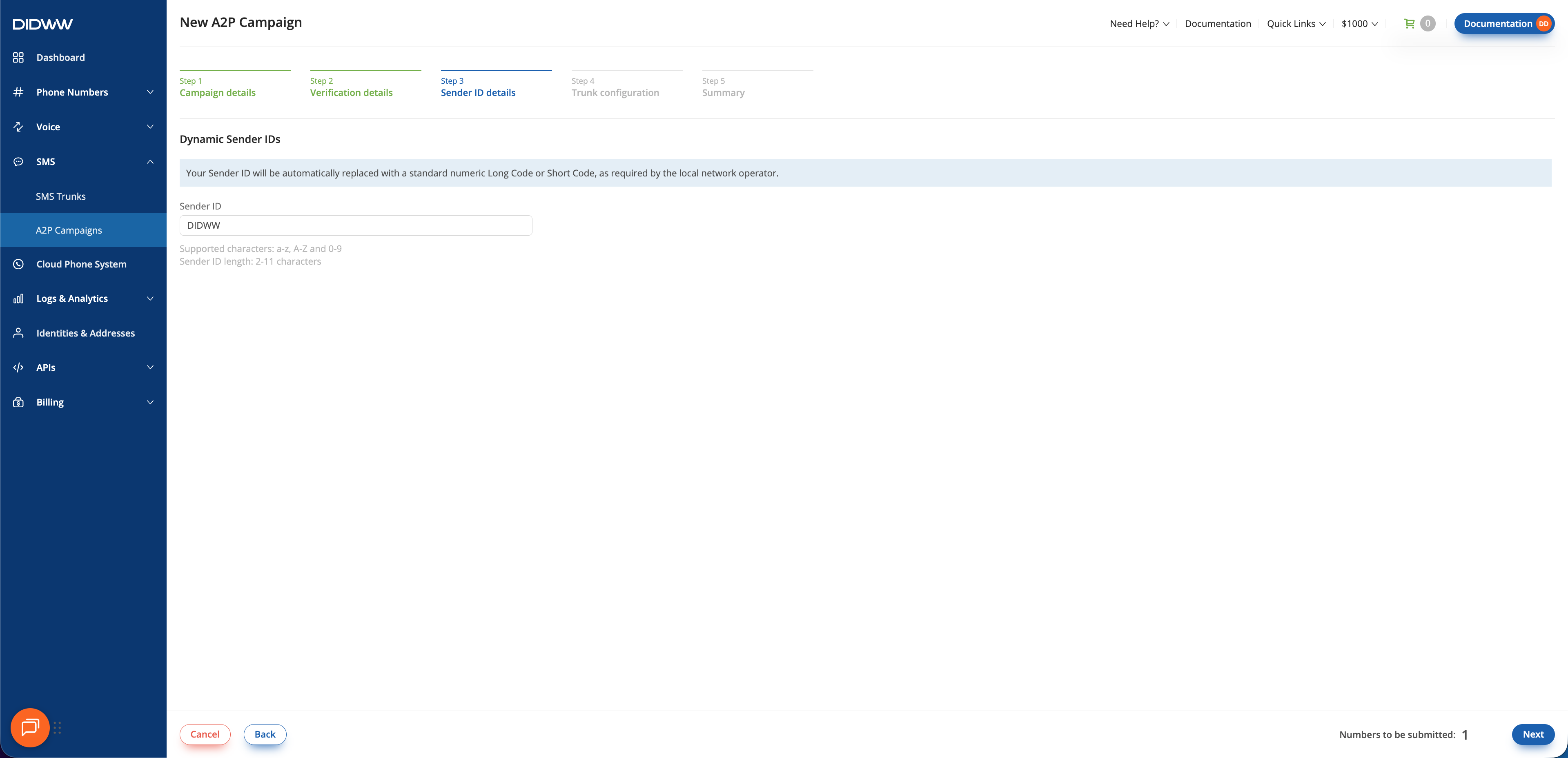 In this step, provide the Sender ID information based on the type selected in Step 1: Campaign Details. Depending on the selected option, you will either select DID numbers or enter the required Sender ID details for your chosen Sender ID type.