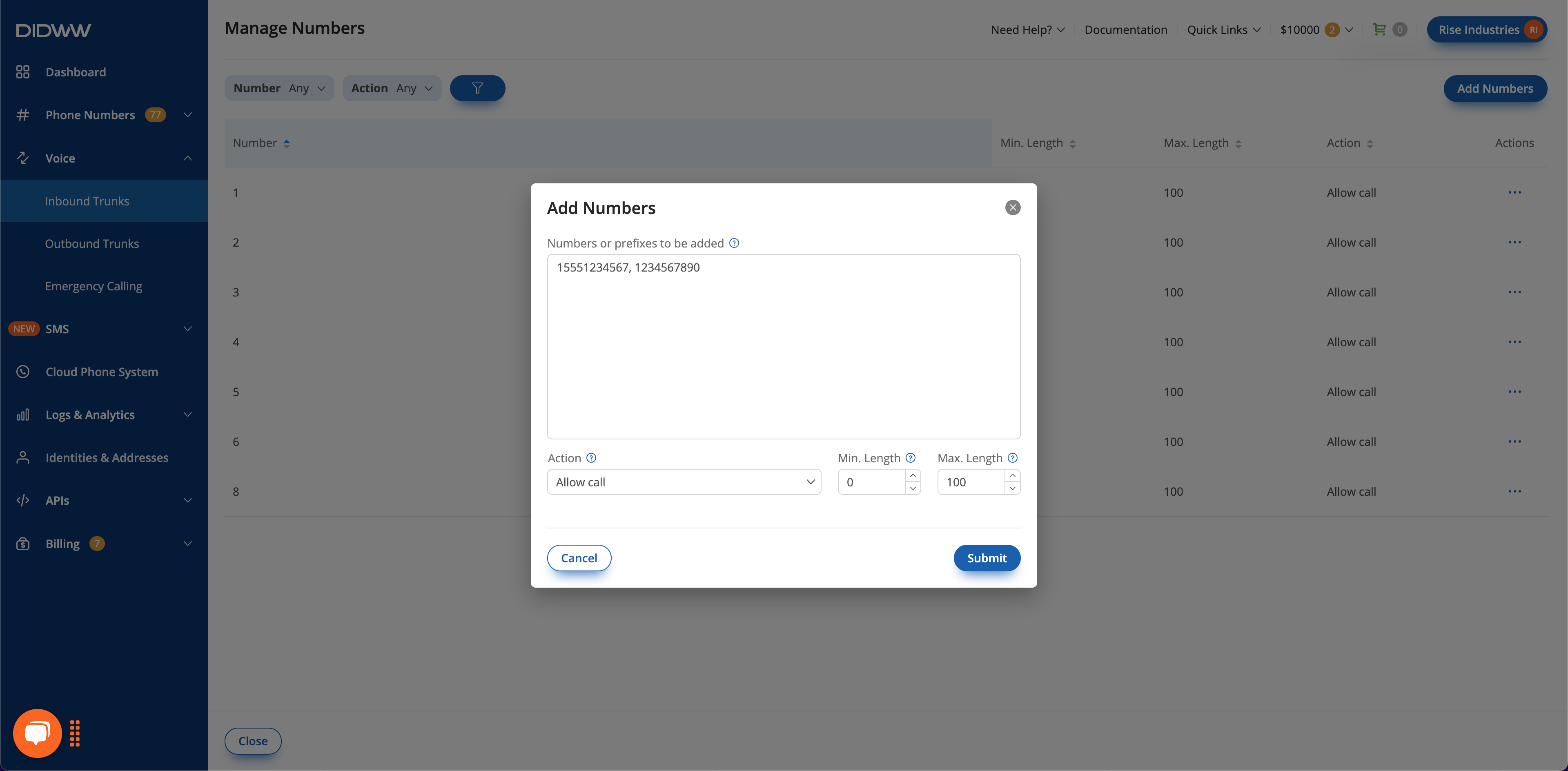 The Number List feature in the DIDWW user panel allows you to manage inbound call filtering by specifying which phone numbers or prefixes should be allowed or rejected. These lists can be linked to inbound SIP trunks, ensuring that only approved calls go through while unwanted ones are rejected.