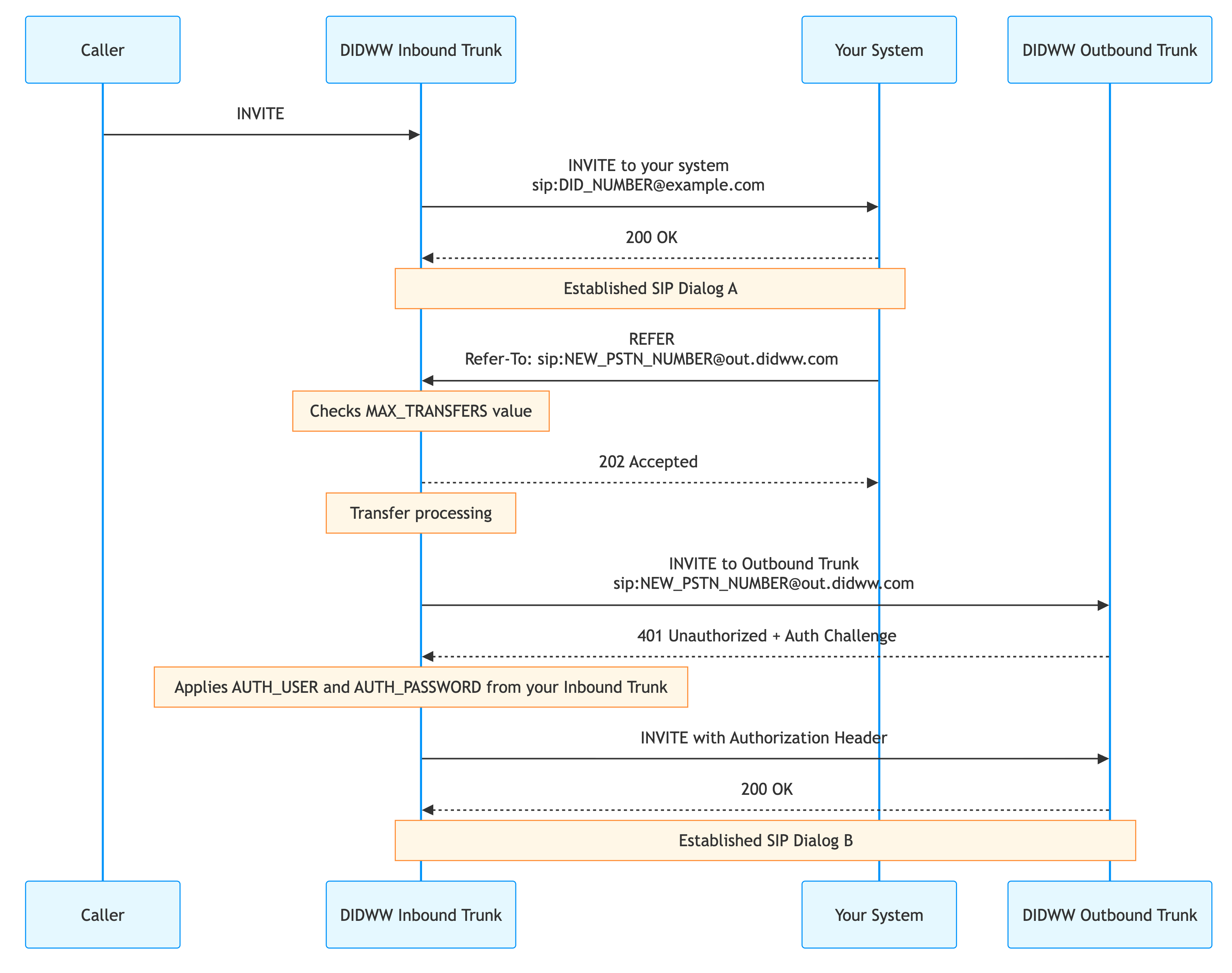 to close the original call leg. DIDWW initiates a new outbound call via your Outbound Trunk, authenticated with the credentials from your Inbound Trunk.